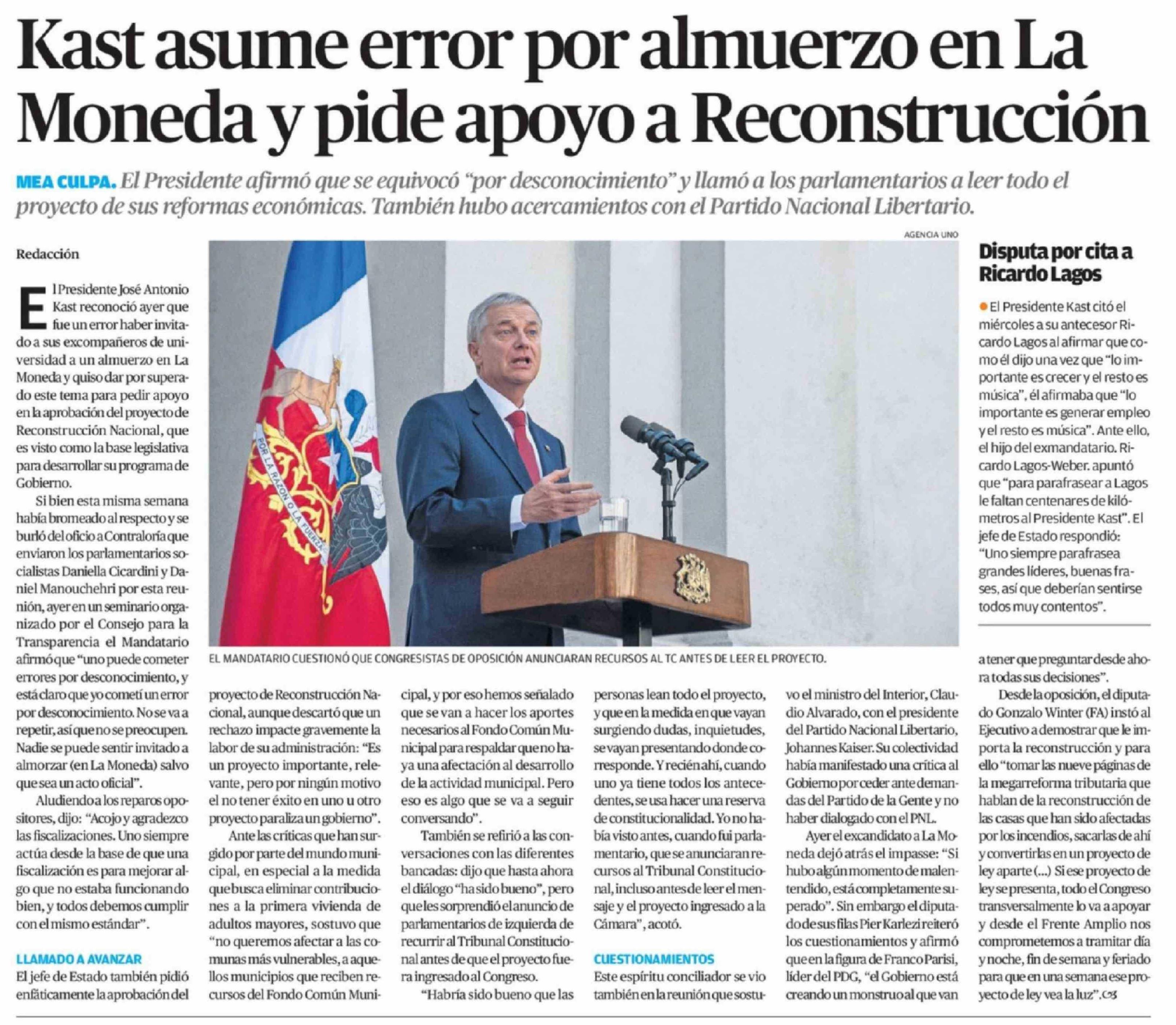 Kast asume error por almuerzo en La Moneda y pide apoyo a Reconstrucción 25-04-2026 El Mercurio de Antofagasta |