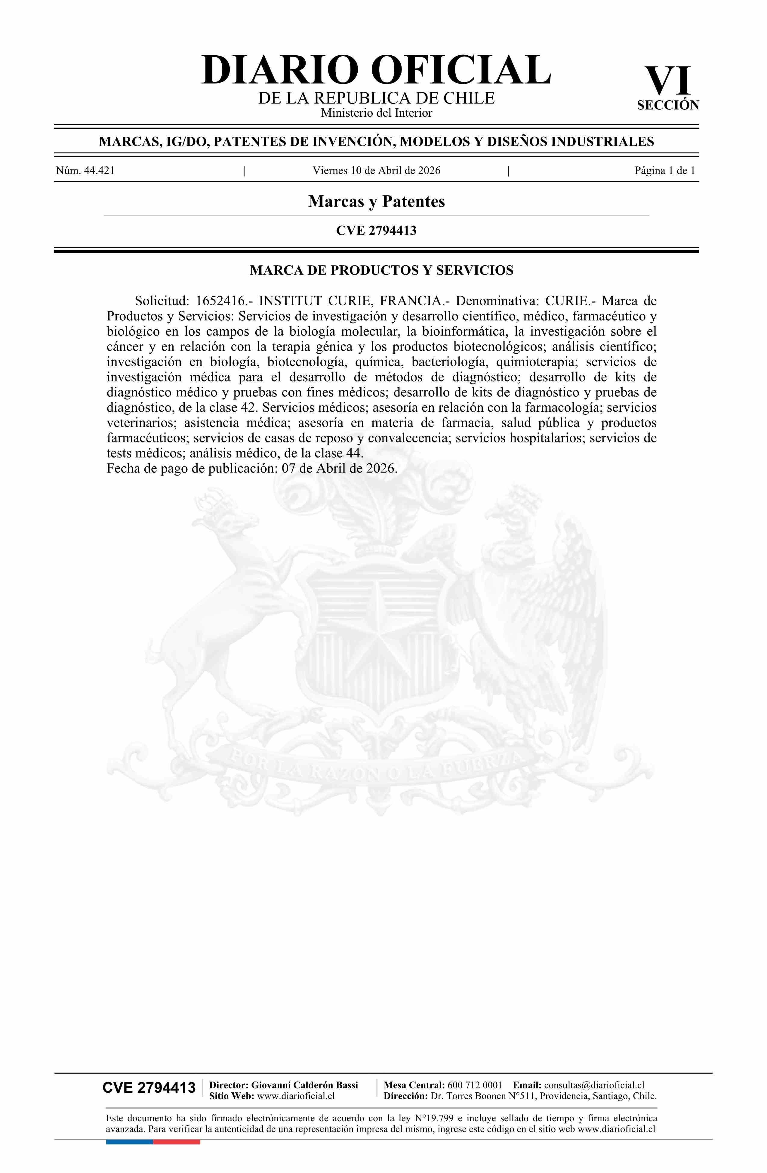 Fuente: Diario Oficial Edición Electrónica (Diario Oficial de Chile - 6 Marcas Y Patentes) Página(s): 84