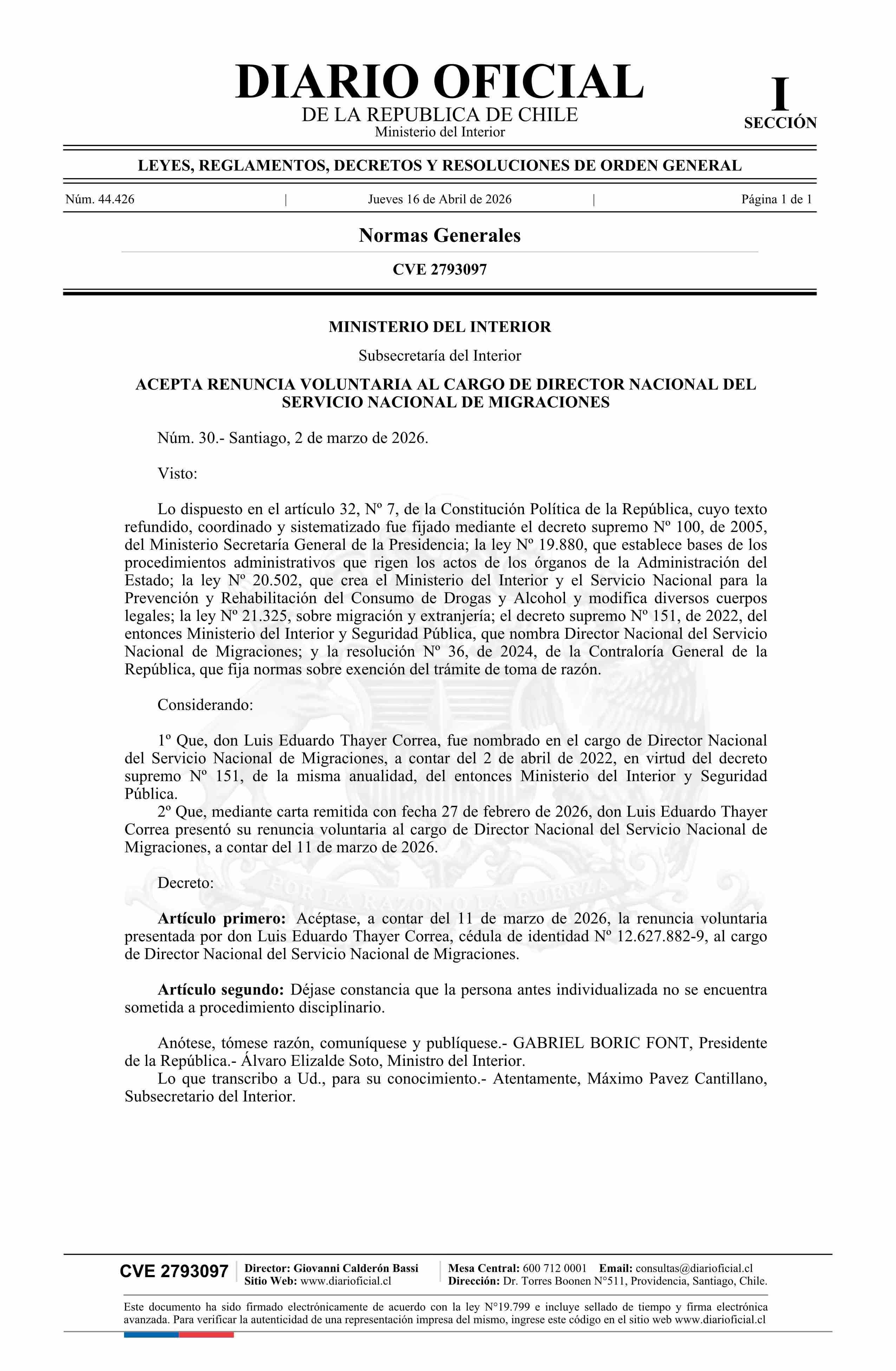 Decreto número 30, de 2026.- Acepta renuncia voluntaria de don Luis Eduardo Thayer Correa al cargo de Director Nacional del Servicio Nacional de Migraciones 16-04-2026 Diario Oficial Edición Electrónica |