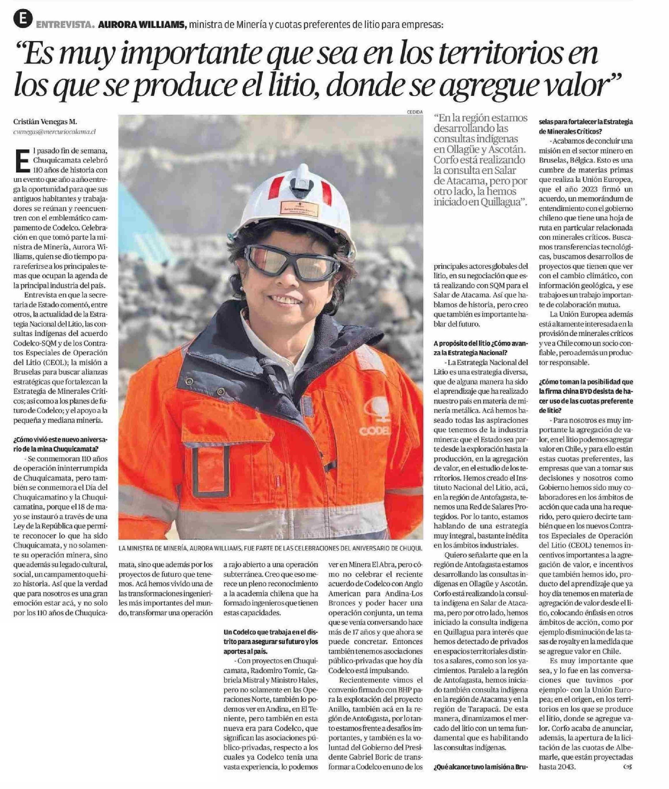 “Es muy importante que sea en los territorios en los que se produce el litio, donde se agregue valor” 21-05-2025 El Mercurio de Antofagasta |