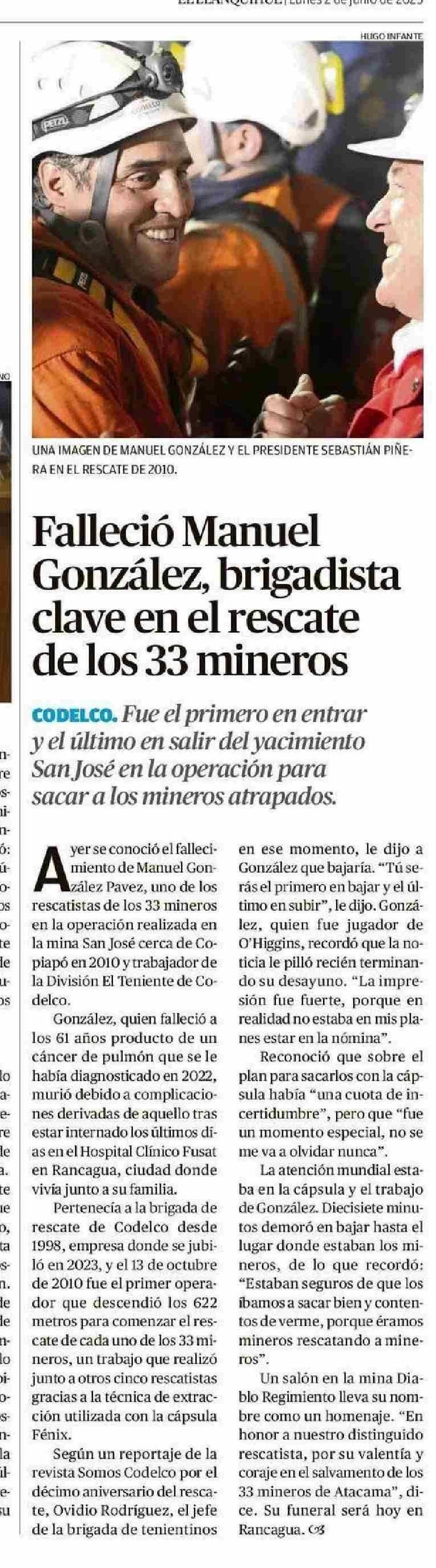 Falleció Manuel | González, brigadista "delos 33 mineros clave en el rescate 02-06-2025 El Llanquihue |