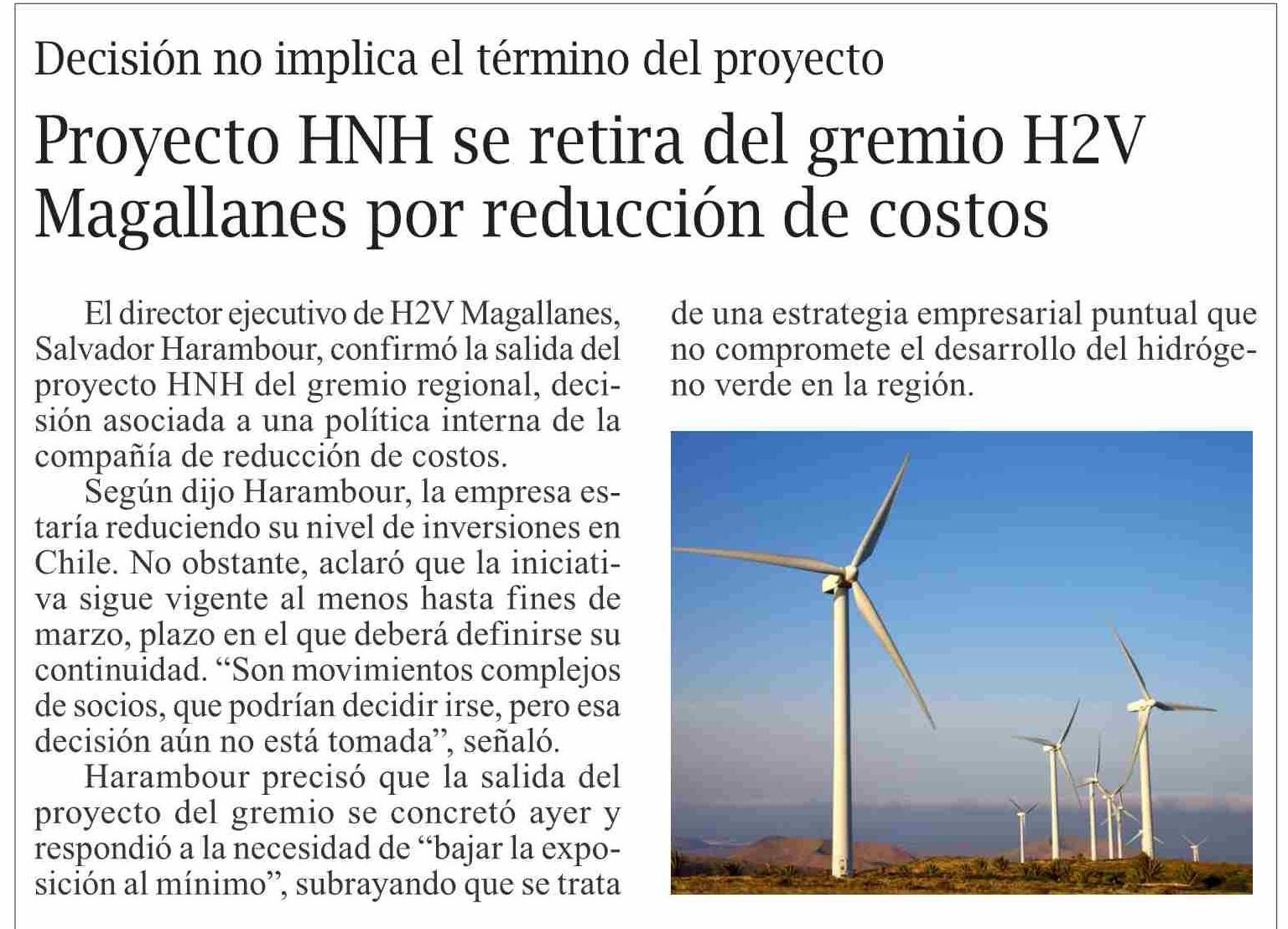 Título: Proyecto HNH se retira del gremio H2V Magallanes por reducción de costos