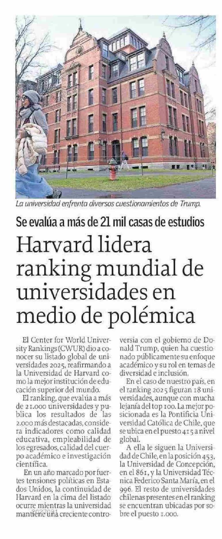 Harvard lidera ranking mundial de universidades en medio de polémica 04-06-2025 El Sur |