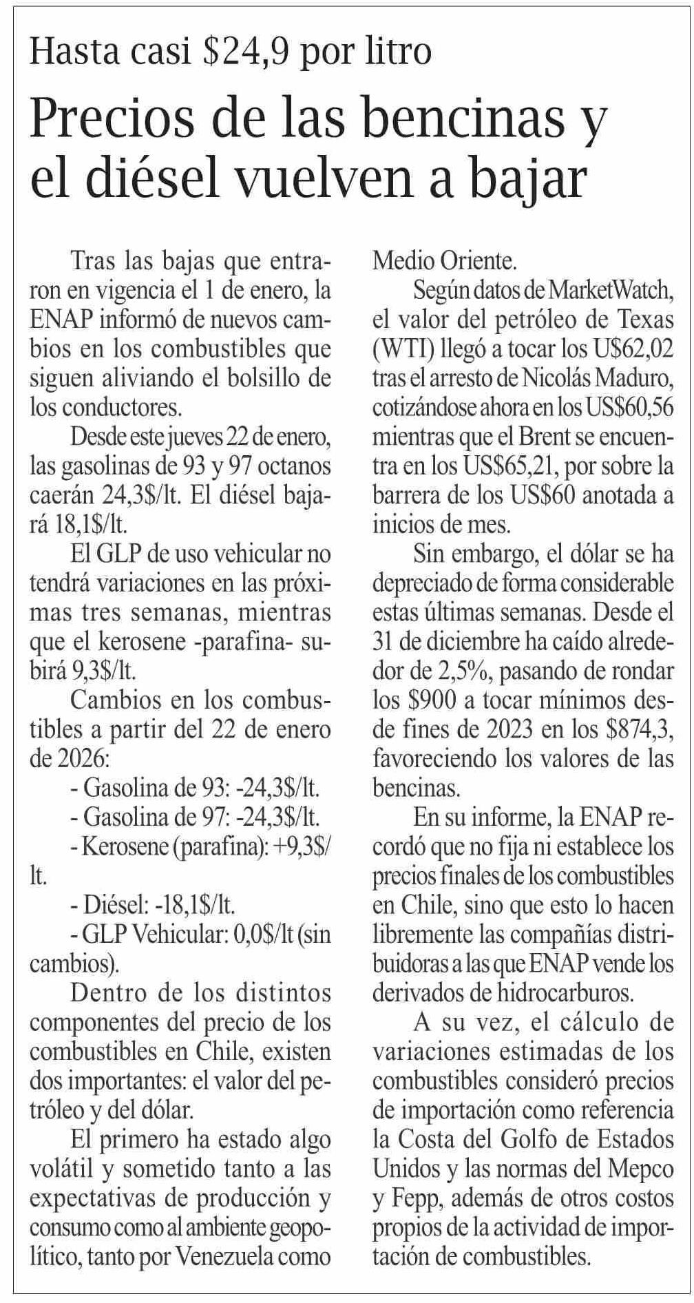 Precios de las bencinas y el diésel vuelven a bajar 22-01-2026 El Pingüino |