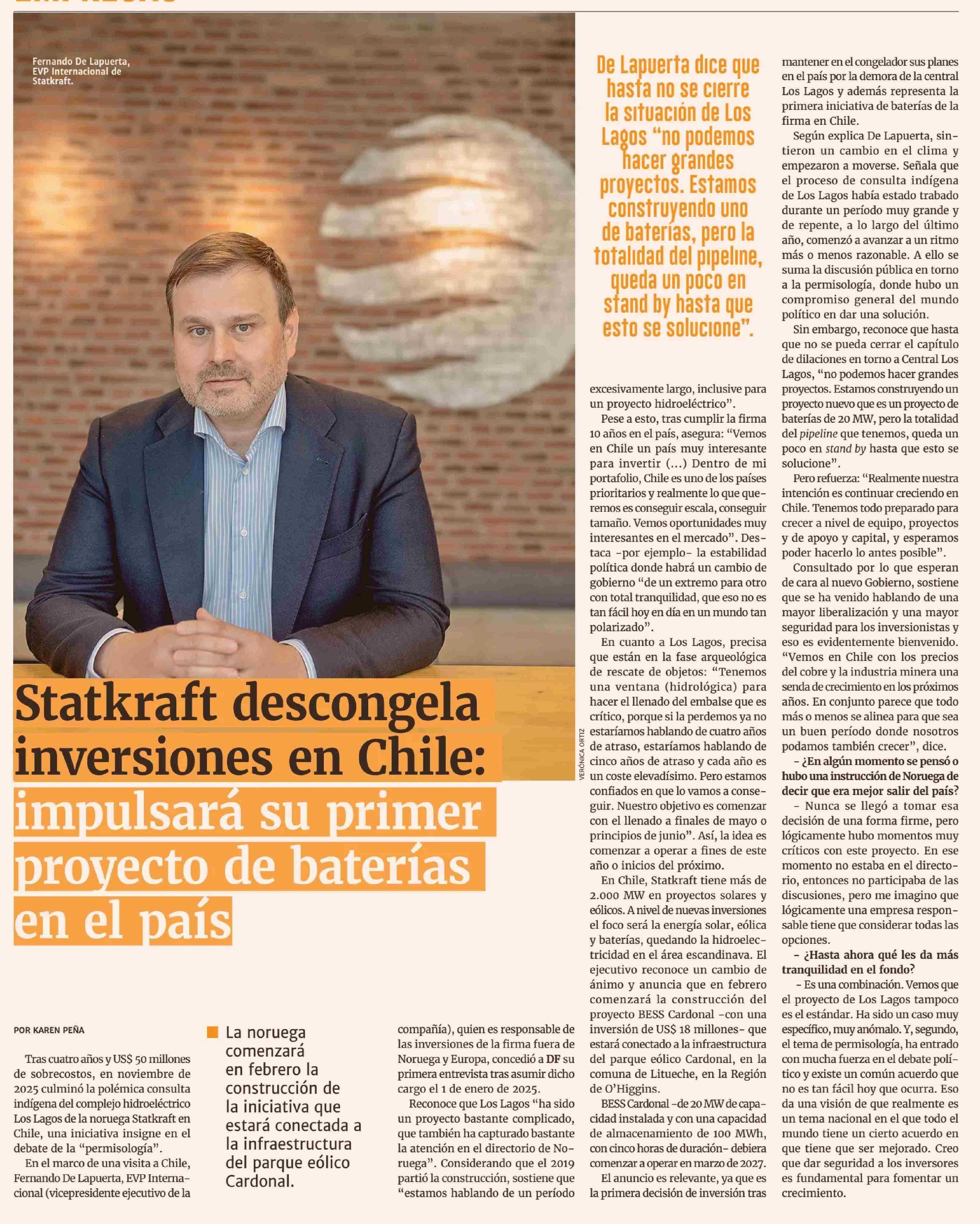 Título: Statkraft descongela inversiones en Chile: impulsará su primer proyecto de baterías en el país