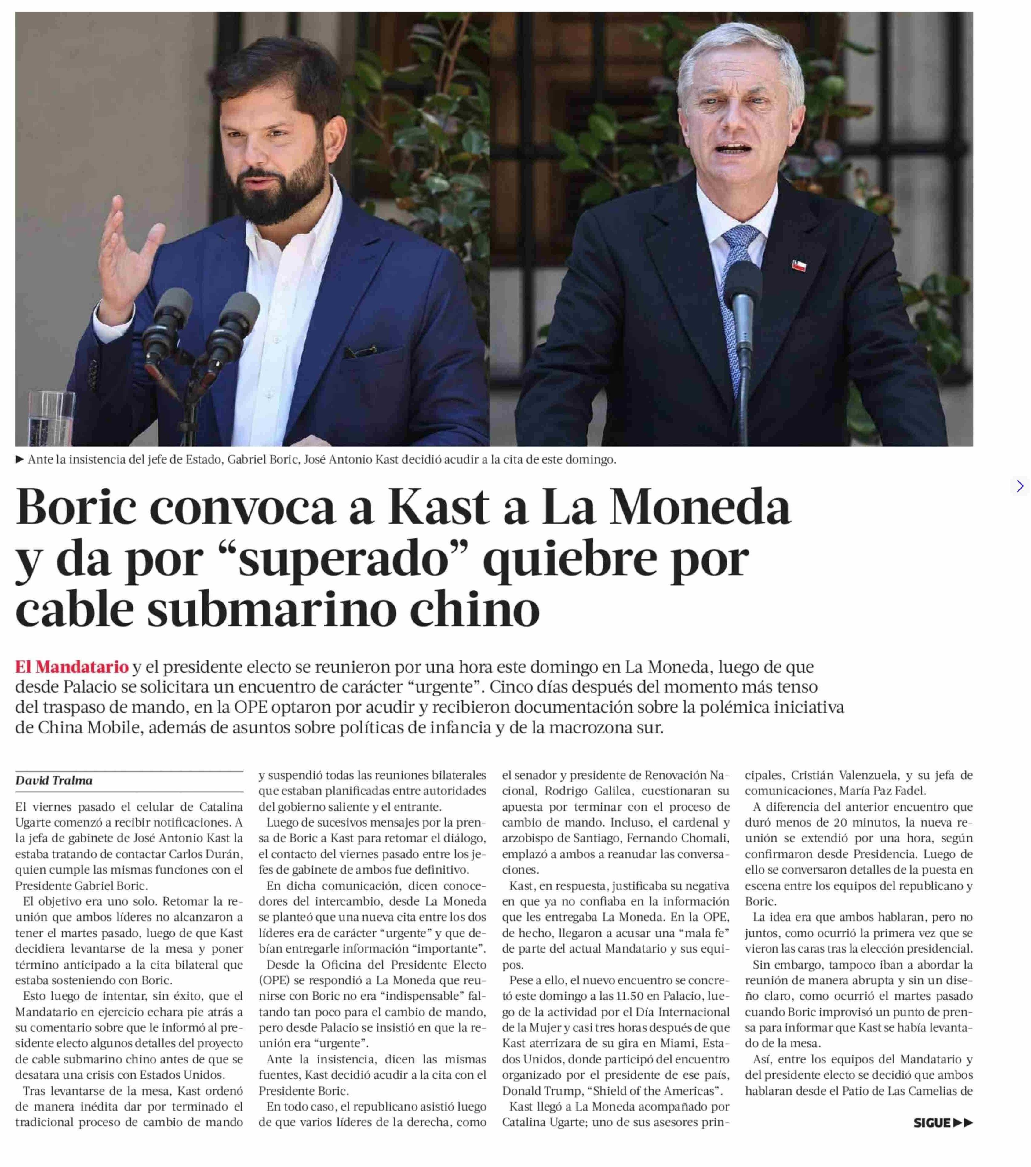 Título: Boric convoca a Kast a La Moneda y da por “superado” quiebre por cable submarino chino