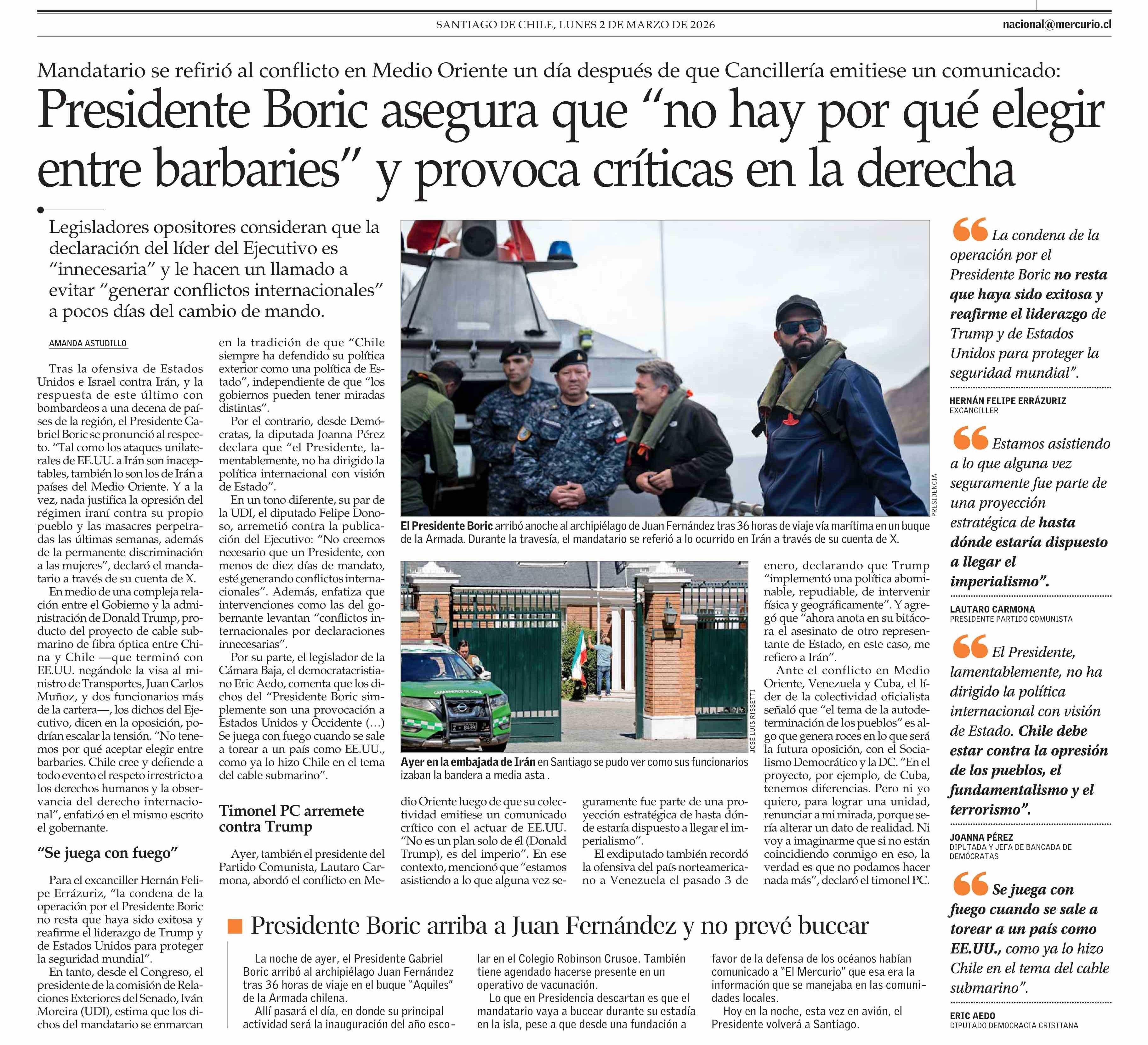 Presidente Boric asegura que “no hay por qué elegir entre barbaries” y provoca críticas en la derecha 02-03-2026 El Mercurio |