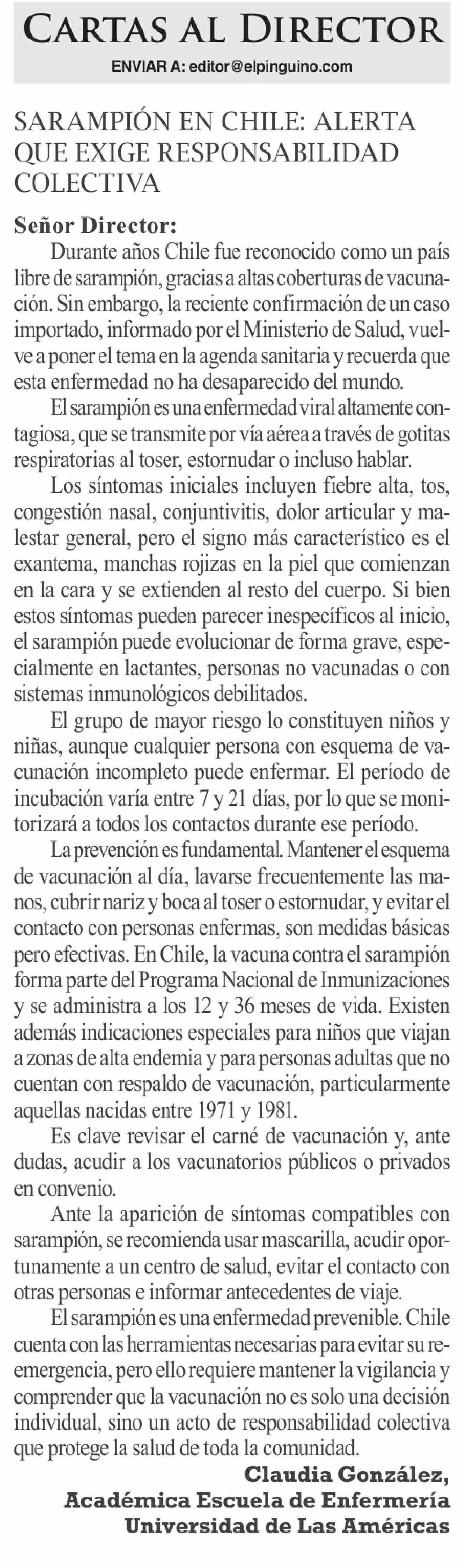 Título: Cartas: SARAMPIÓN EN CHILE: ALERTA QUE EXIGE RESPONSABILIDAD COLECTIVA Señor Director: Durante años Chile fue reconocido como un país libre de sarampión, gracias a altas coberturas de vacunación. Sin embargo, la reciente confirmación de un caso importado, informado por el Ministerio de Salud, vuelve
