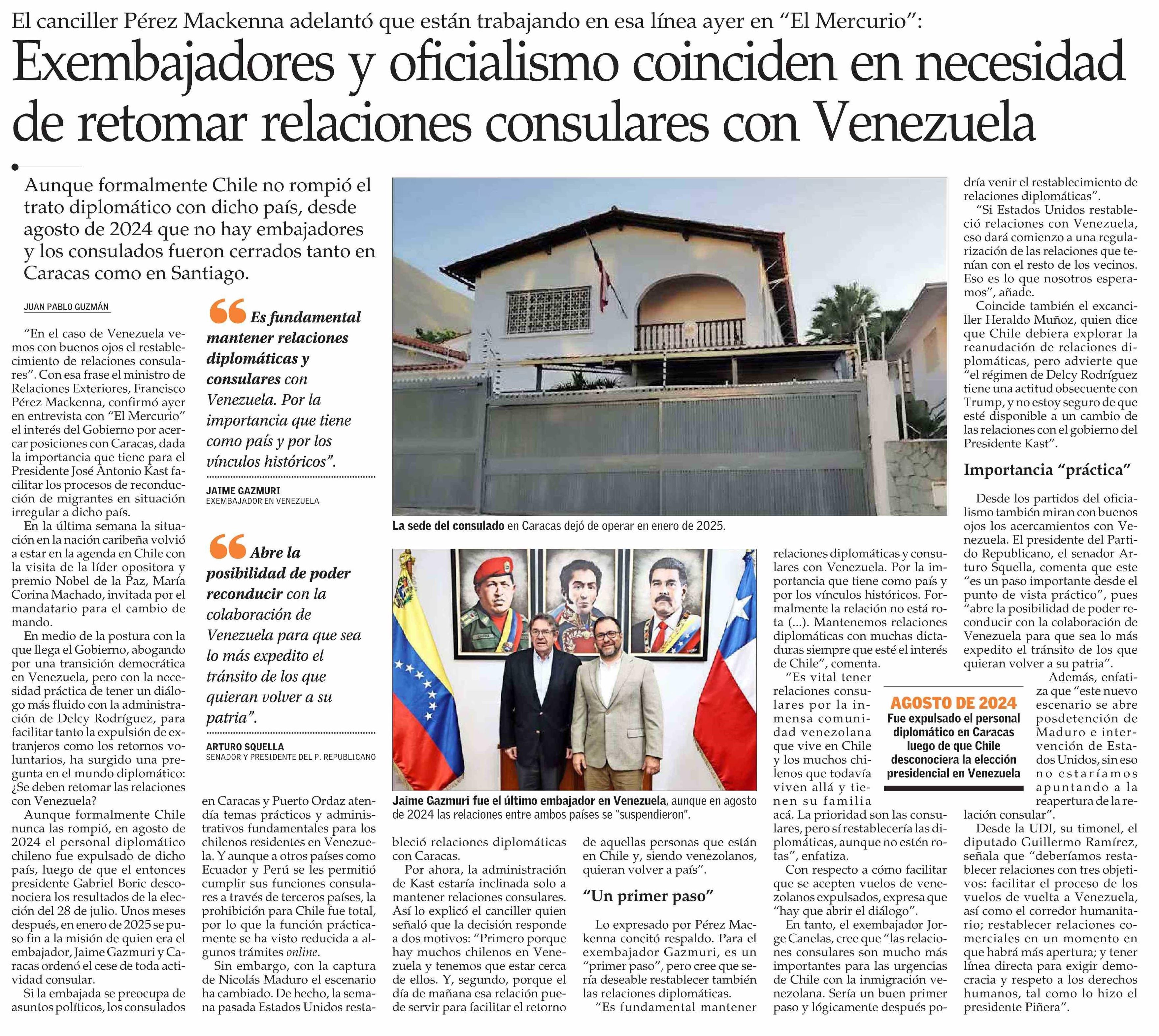 Exembajadores y oficialismo coinciden en necesidad de retomar relaciones consulares con Venezuela 16-03-2026 El Mercurio |