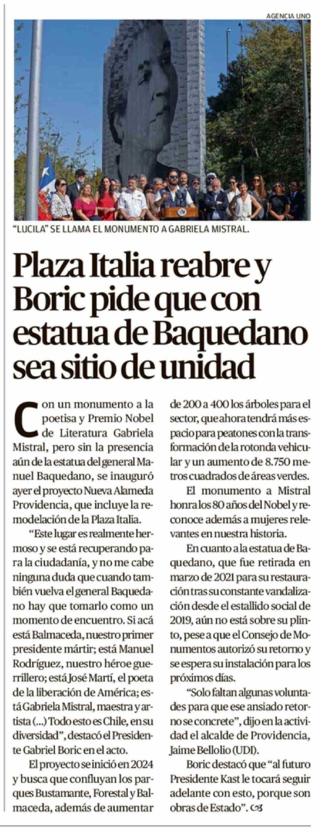 Título: Plaza Italia reabre y Boric pide que con estatua de Baquedano sea sitio de unidad