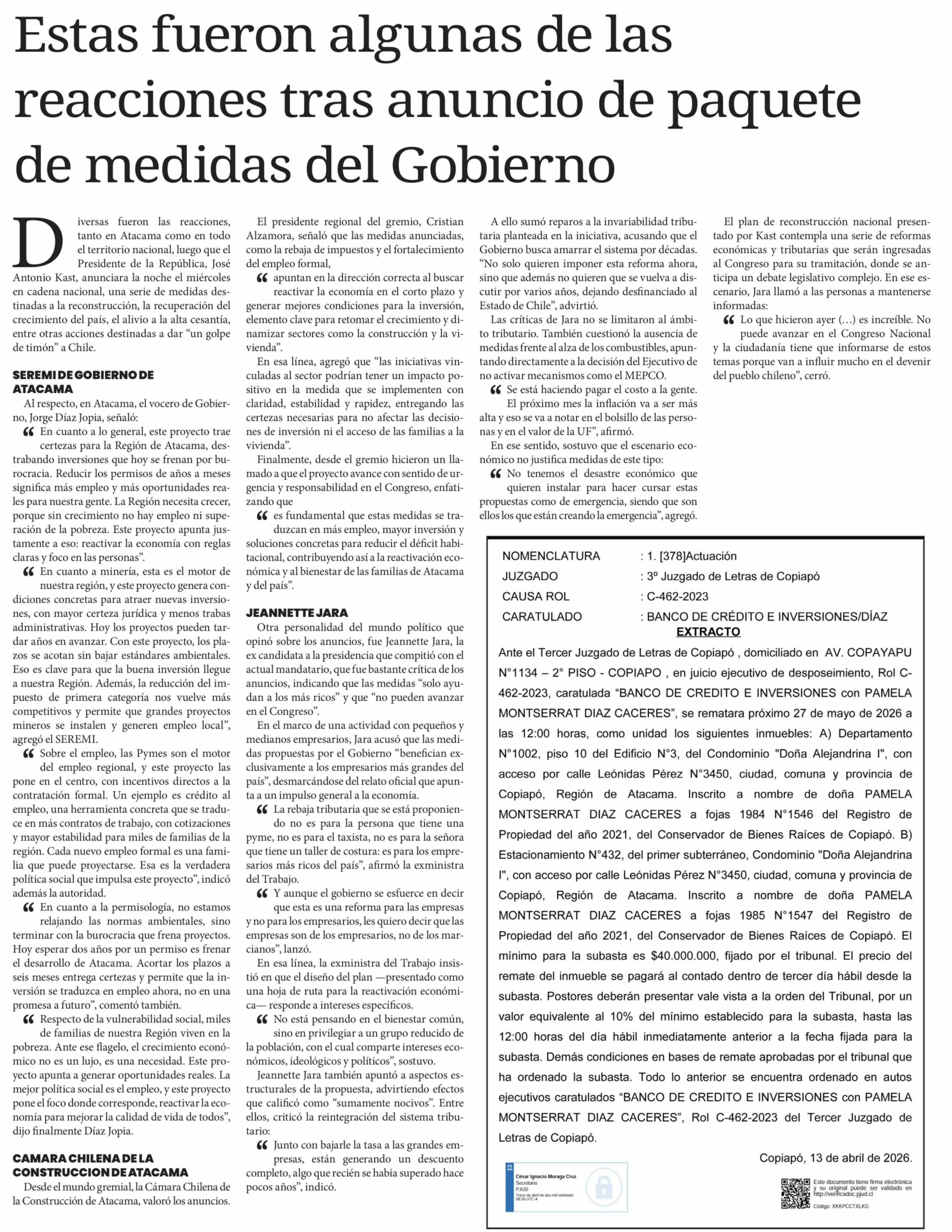 Estas fueron algunas de las reacciones tras anuncio de paquete de medidas del Gobierno 17-04-2026 Diario Chañarcillo |