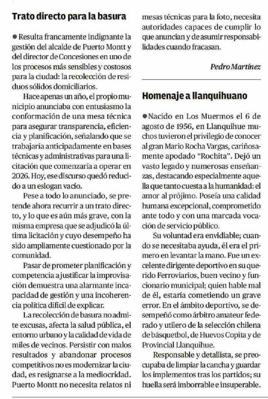 Cartas: Trato directo para la basura 26-01-2026 El Llanquihue |