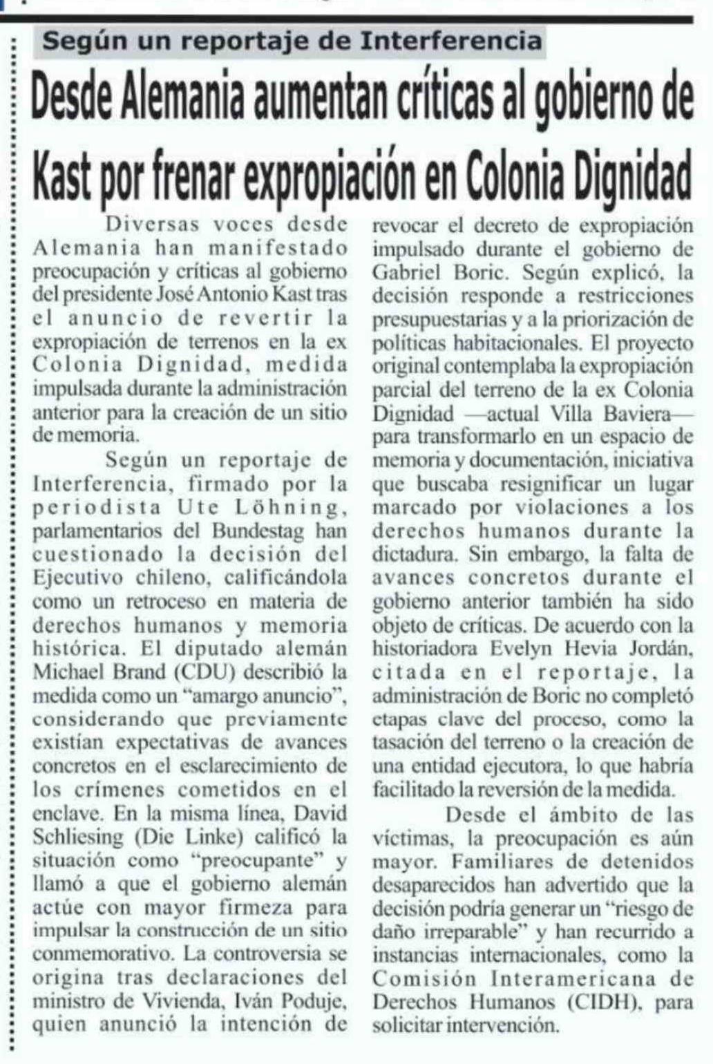 | Título: | Desde Alemania aumentan críticas al gobierno de Kast por frenar expropiación en Colonia Dignidad |