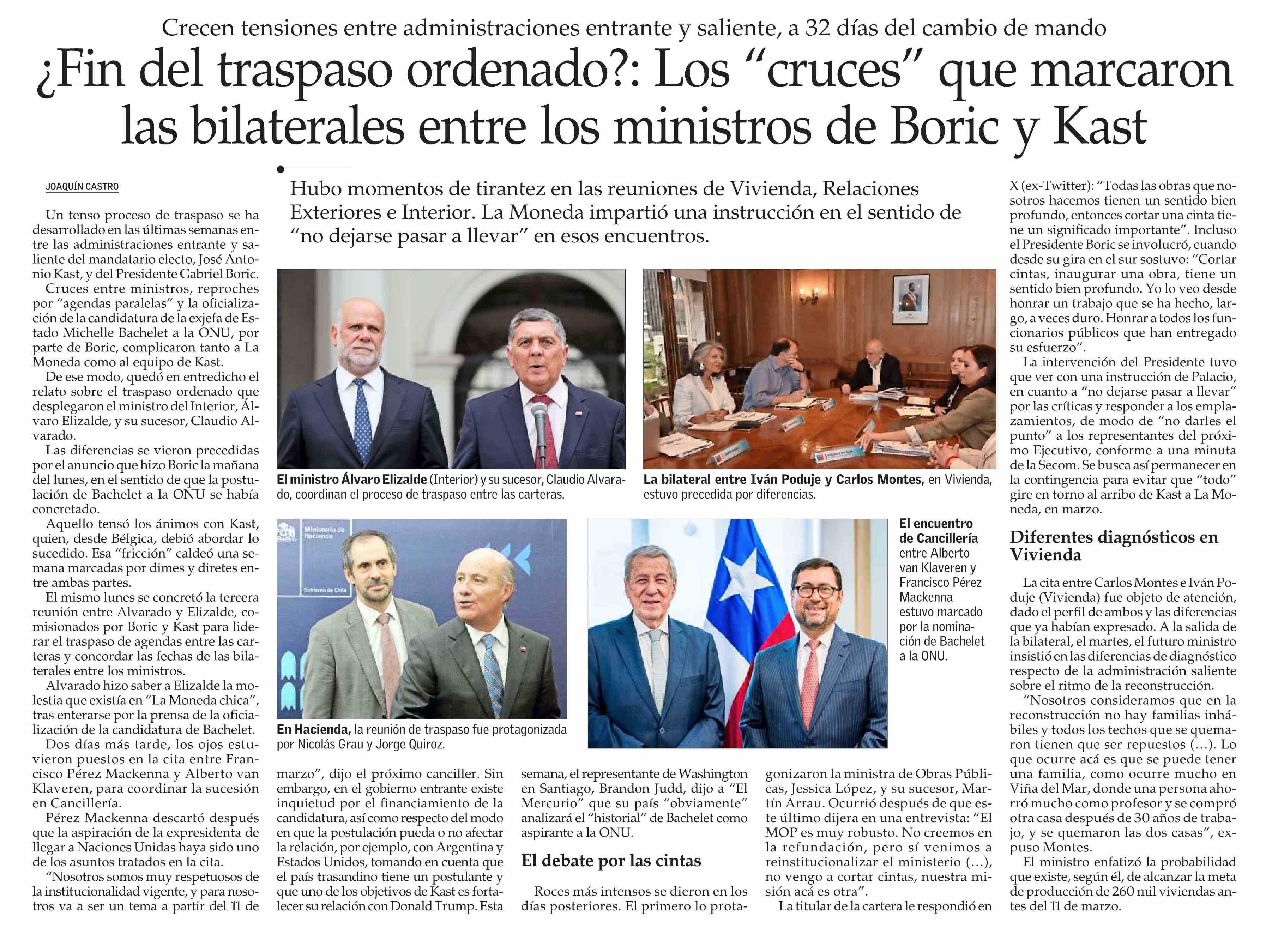 Título: ¿Fin del traspaso ordenado?: Los "cruces" que marcaron las bilaterales entre los ministros de Boric y Kast
