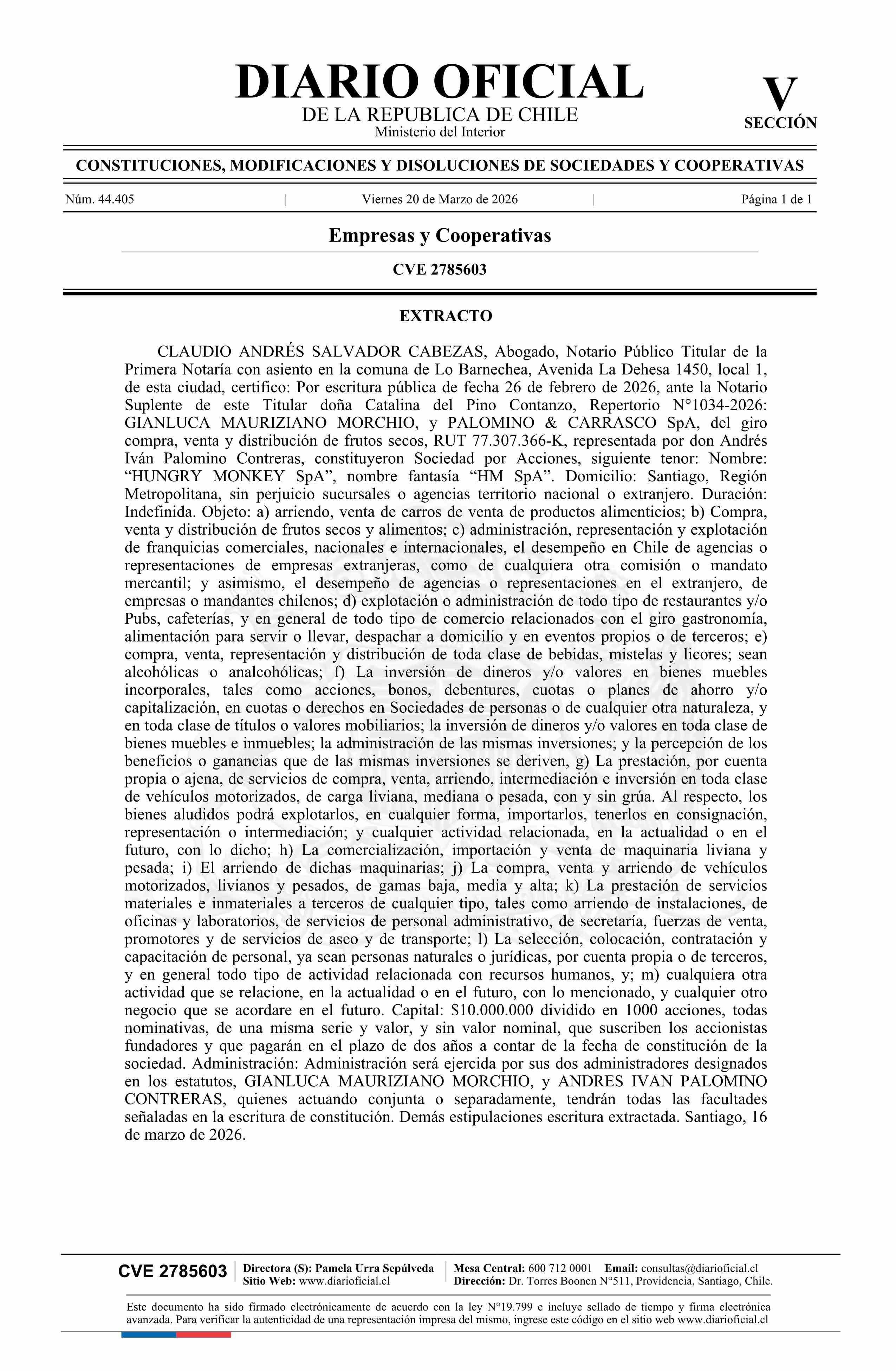 Hungry Monkey SpA 20-03-2026 Diario Oficial Edición Electrónica |