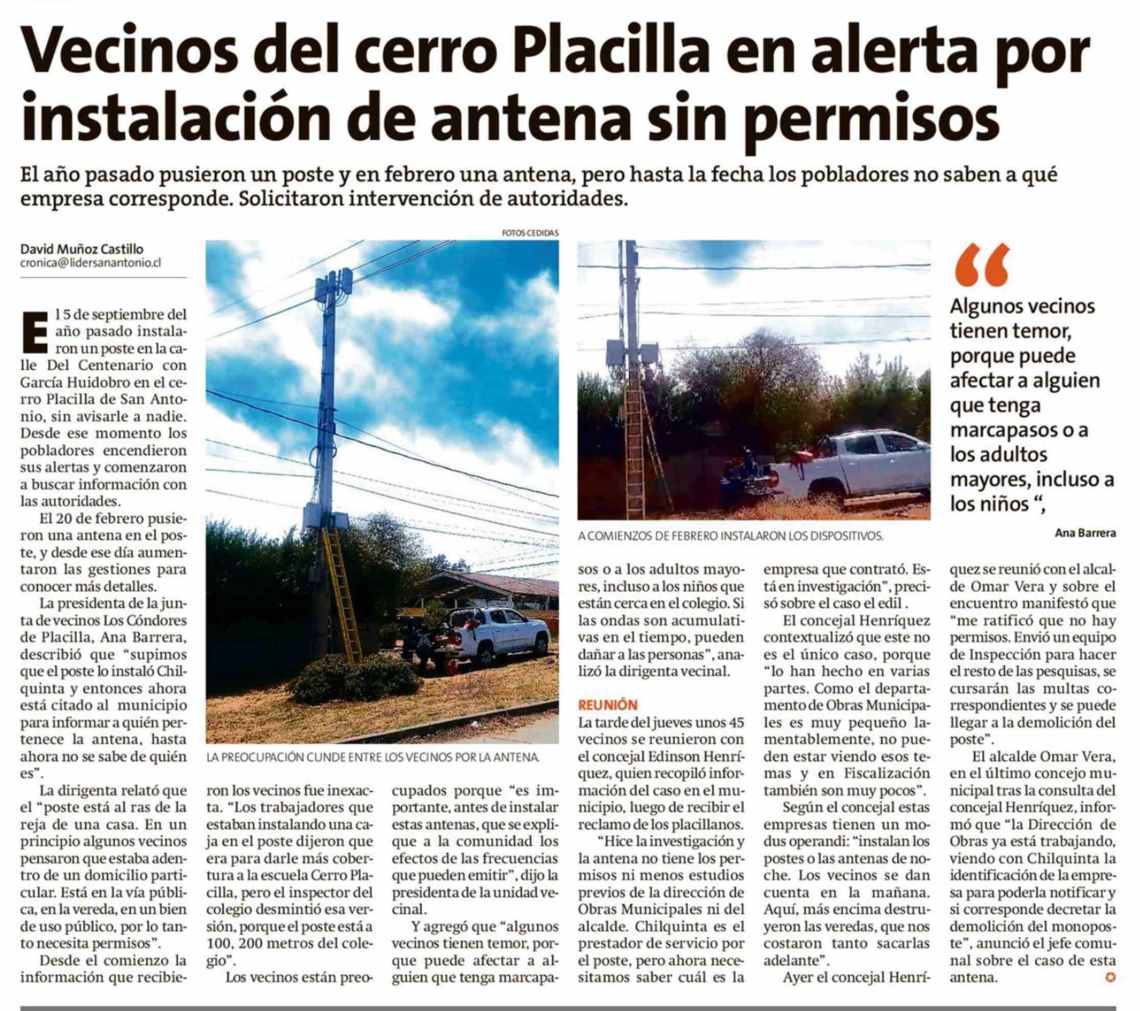 Vecinos del cerro Placilla en alerta por instalación de antena sin permisos 07-03-2026 El Líder |