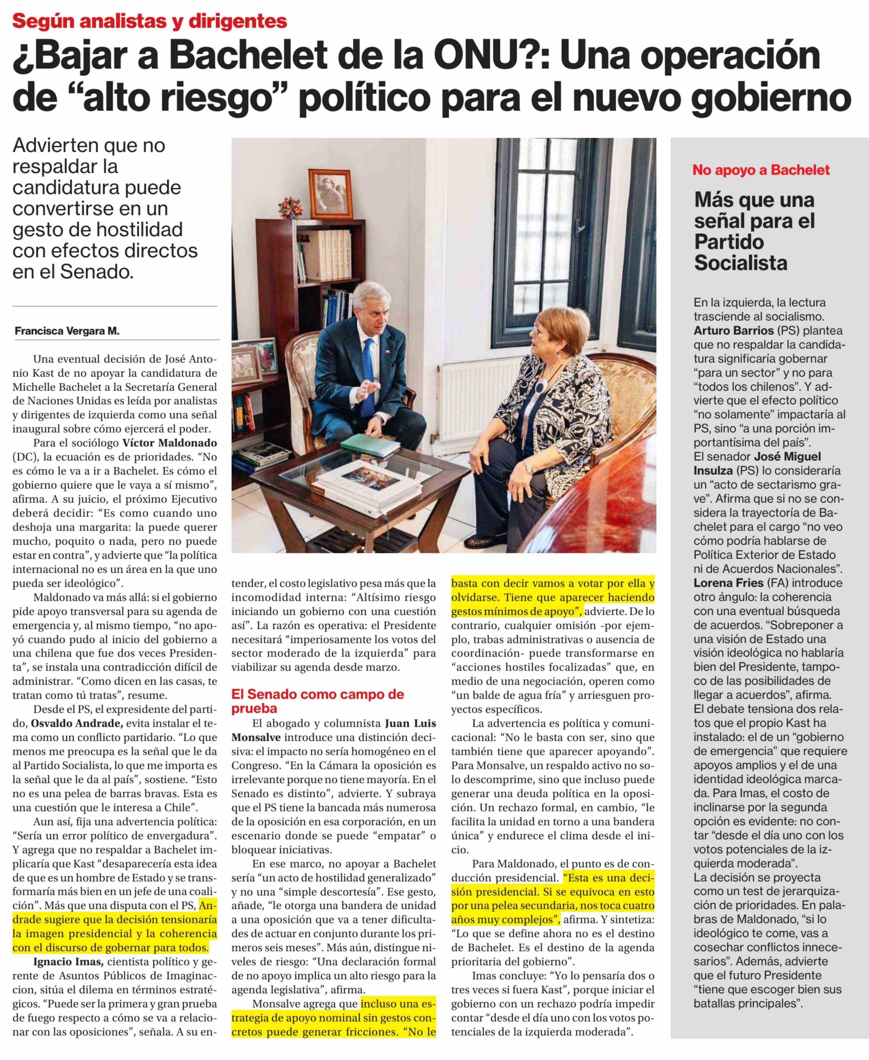 ¿Bajar a Bachelet de la ONU ?: Una operación de "alto riesgo" político para el nuevo gobierno 16-02-2026 La Segunda |