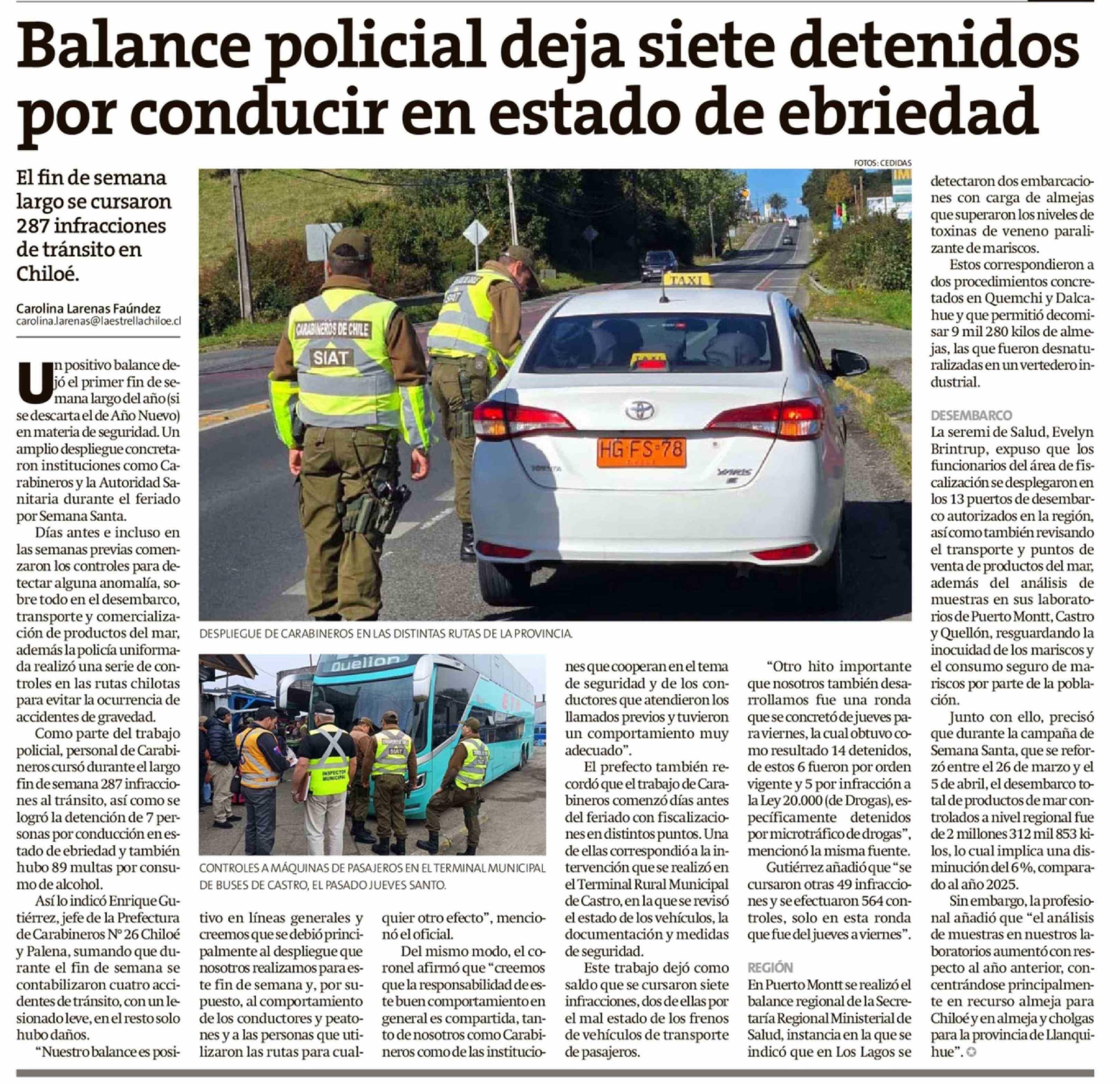 Balance policial deja siete detenidos por conducir en estado de ebriedad 07-04-2026 La Estrella de Chiloé |