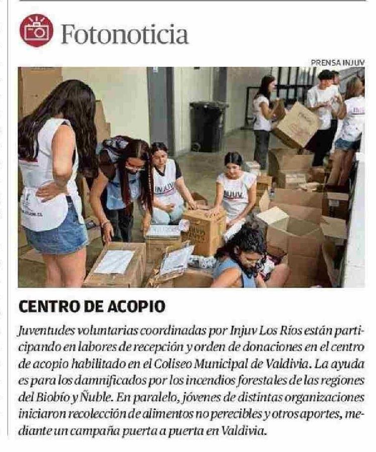 | Título: | CENTRO DE ACOPIO Juventudes voluntarias coordinadas por Injuv Los Ríos están participando en labores de recepción y orden de donaciones en el centro de acopio habilitado en el Coliseo Municipal de Valdivia. La ayuda es para los damnificados por los incendios forestales de las regiones del Biobío y Ñ |