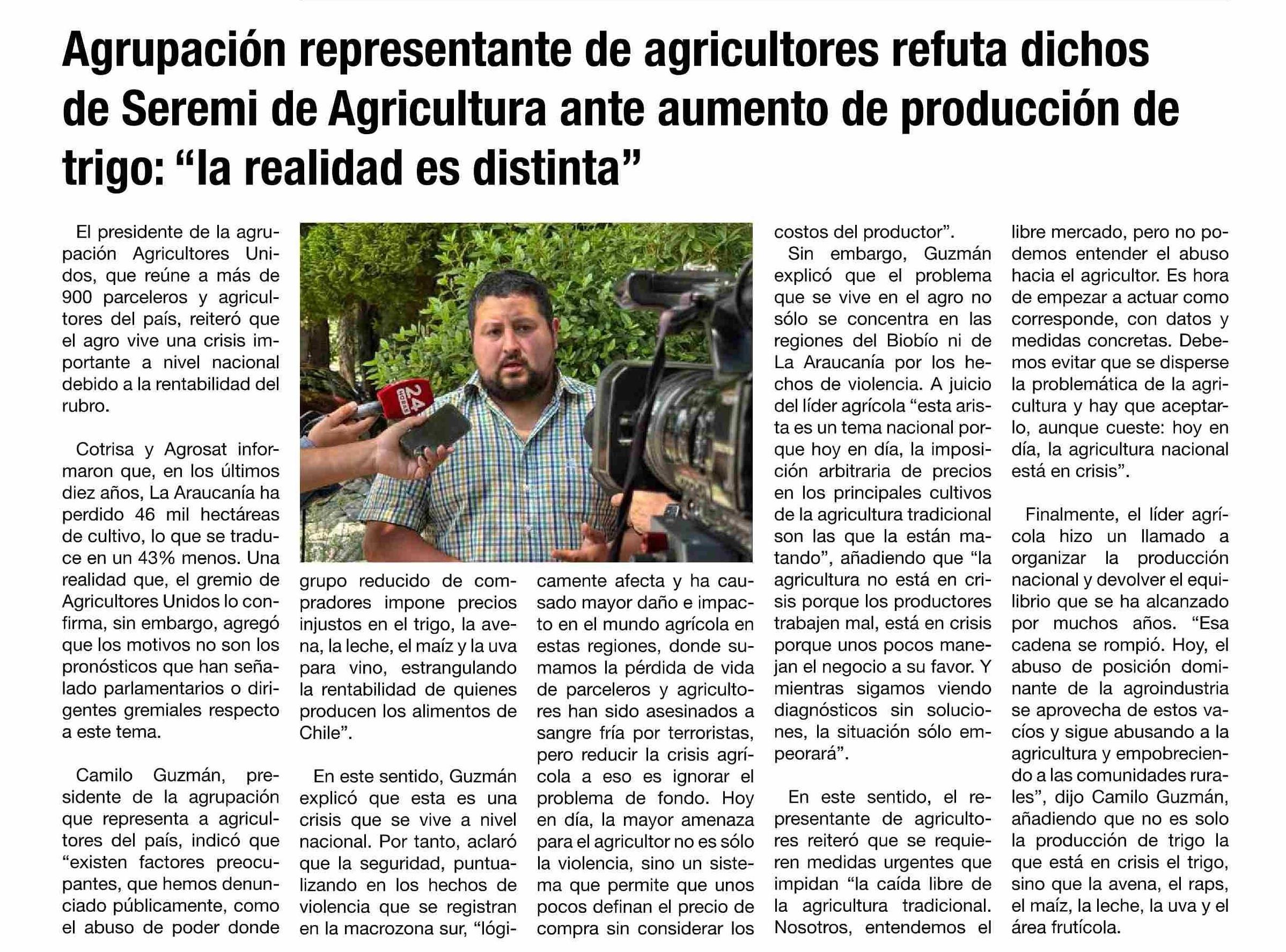 | Título: | Agrupación representante de agricultores refuta dichos de Seremi de Agricultura ante aumento de producción de trigo: “la realidad es distinta” |