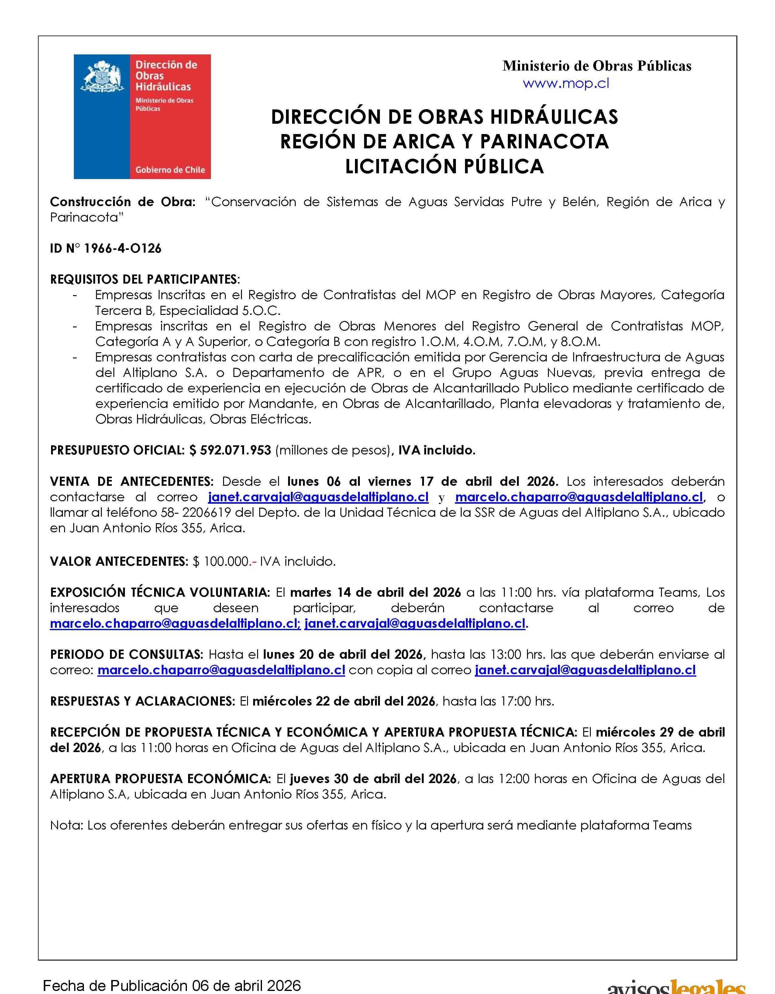 AVISO LICITACIONES: DIRECCIÓN DE OBRAS HIDRÁULICAS REGIÓN DE ARICA Y PARINACOTA LICITACIÓN PÚBLICA 07-04-2026 El Mostrador - Avisos Legales |
