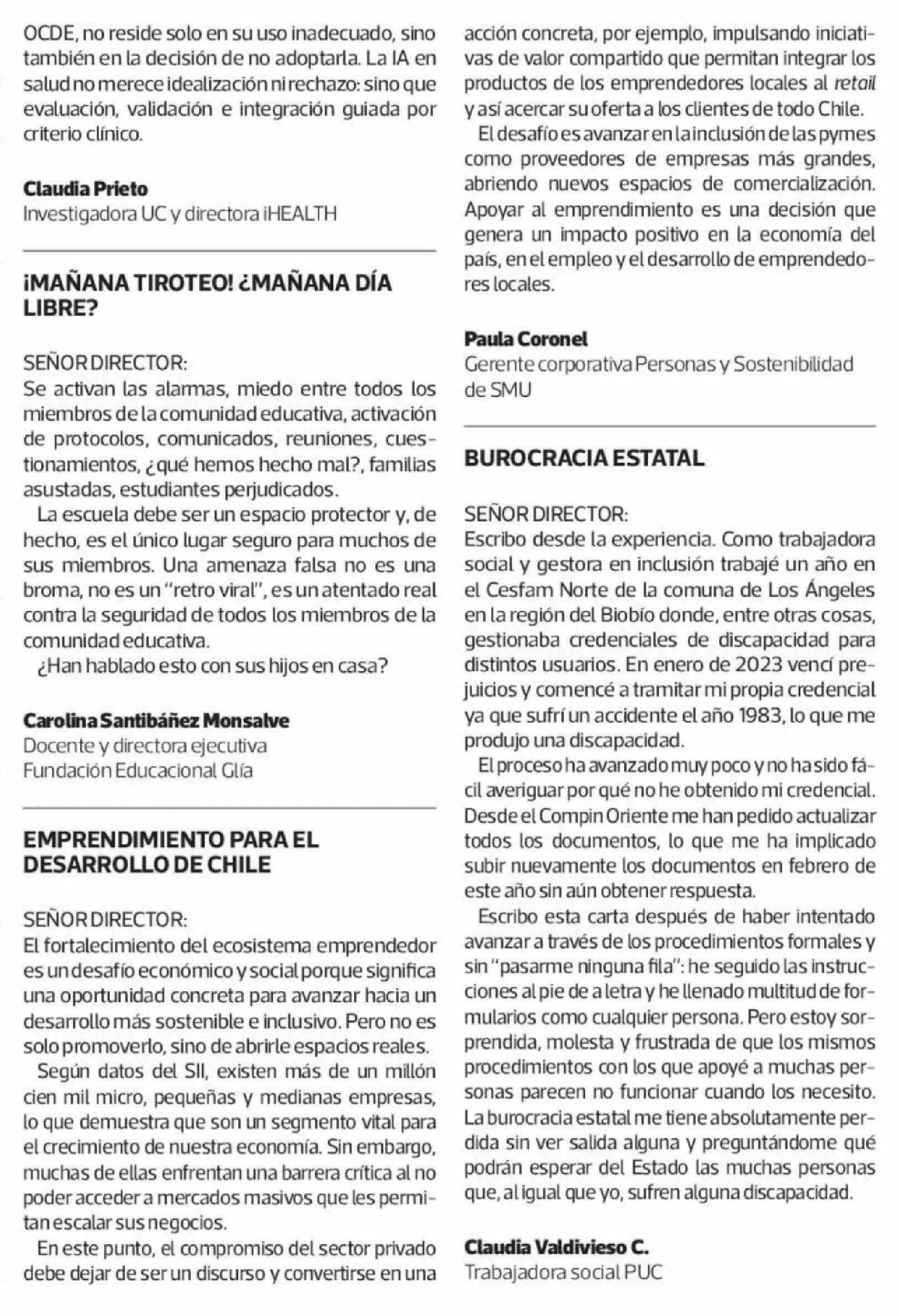 Cartas: EMPRENDIMIENTO PARA EL DESARROLLO DE CHILE 20-04-2026 La Tercera |