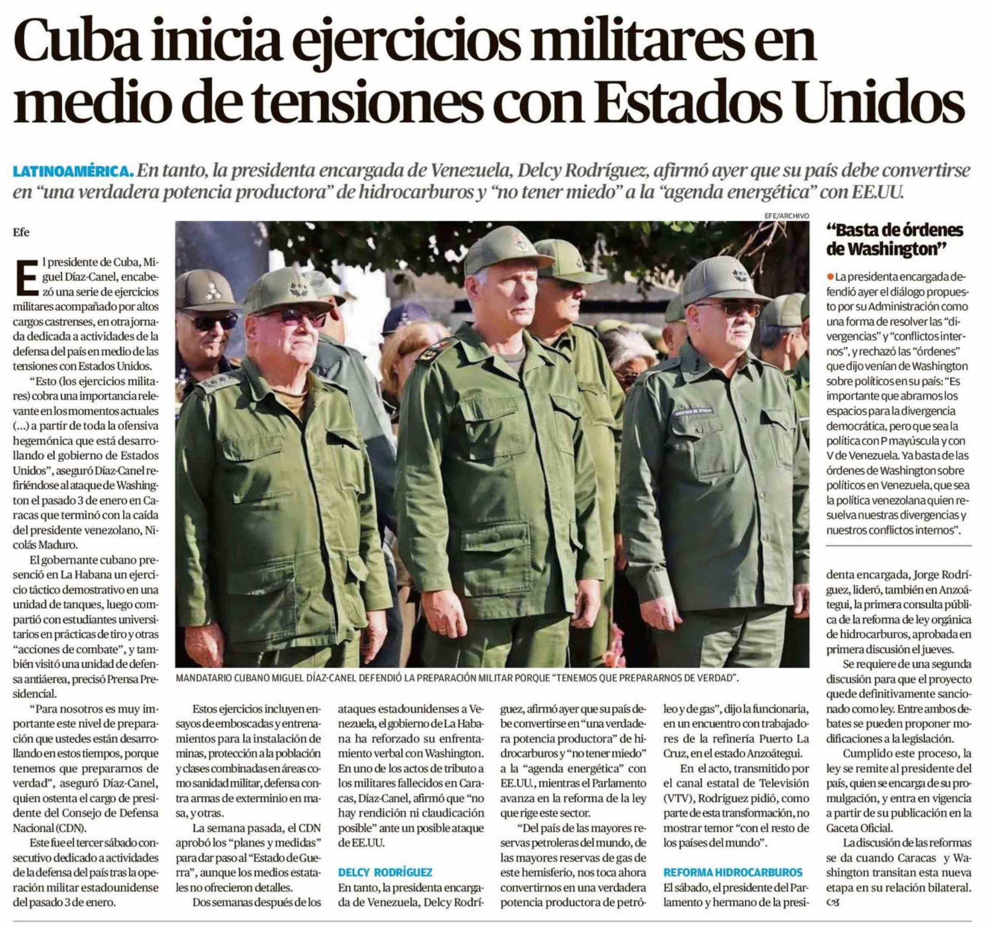 Cuba inicia ejercicios militares en medio de tensiones con Estados Unidos 26-01-2026 El Austral de Osorno |