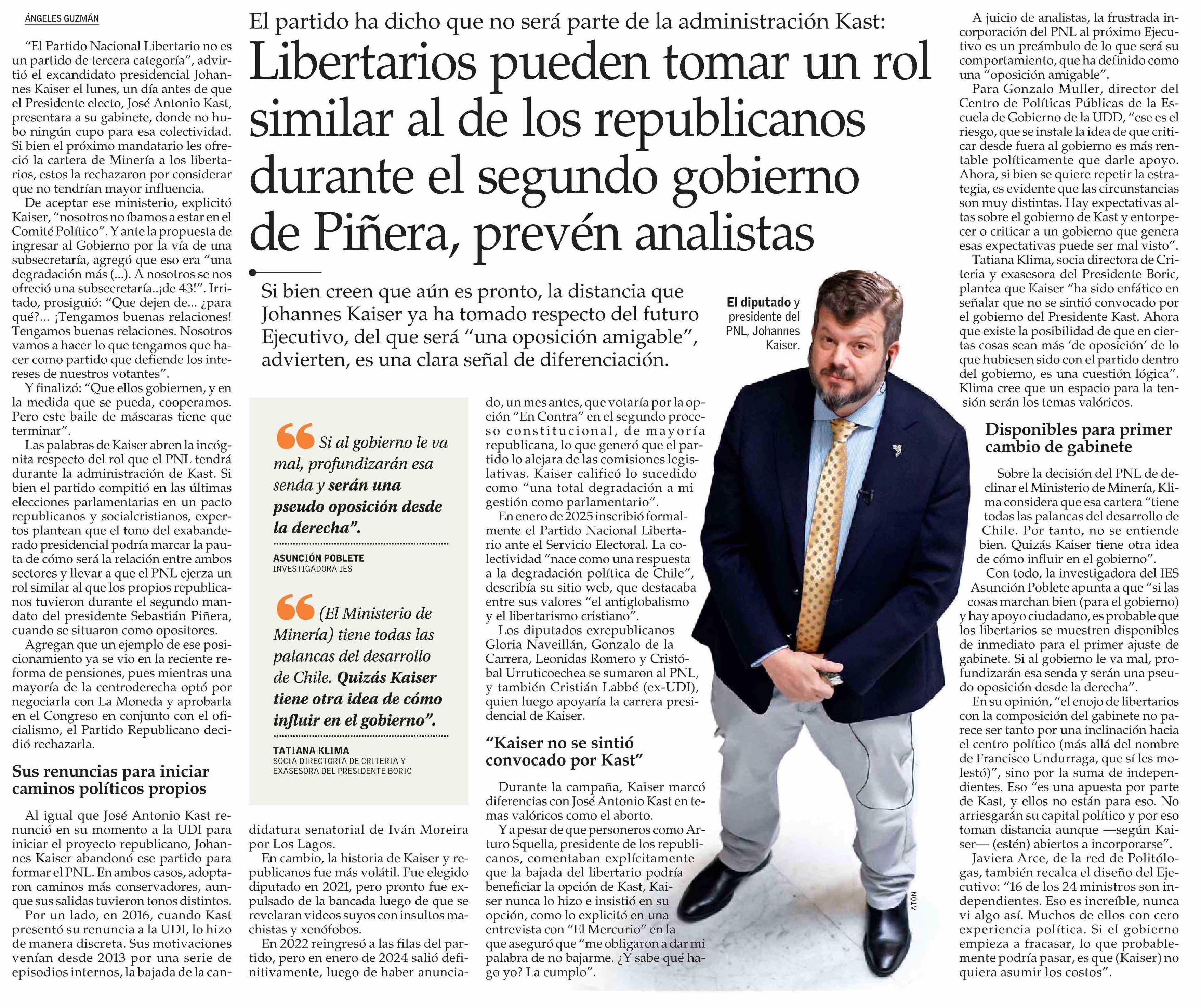 Libertarios pueden tomar un rol similar al de los republicanos durante el segundo gobierno de Piñera, prevén analistas 24-01-2026 El Mercurio |