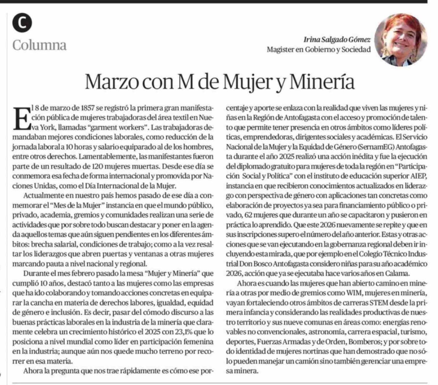 Columnas de Opinión: Marzo con M de Mujer y Minería 09-03-2026 El Mercurio de Calama |