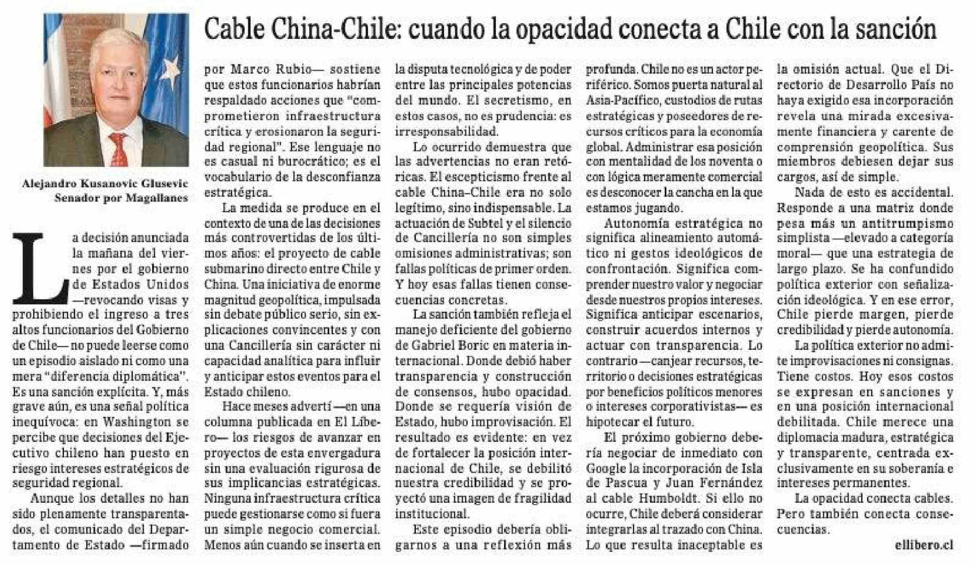 Título: Columnas de Opinión: Cable China-Chile: cuando la opacidad conecta a Chile con la sanción