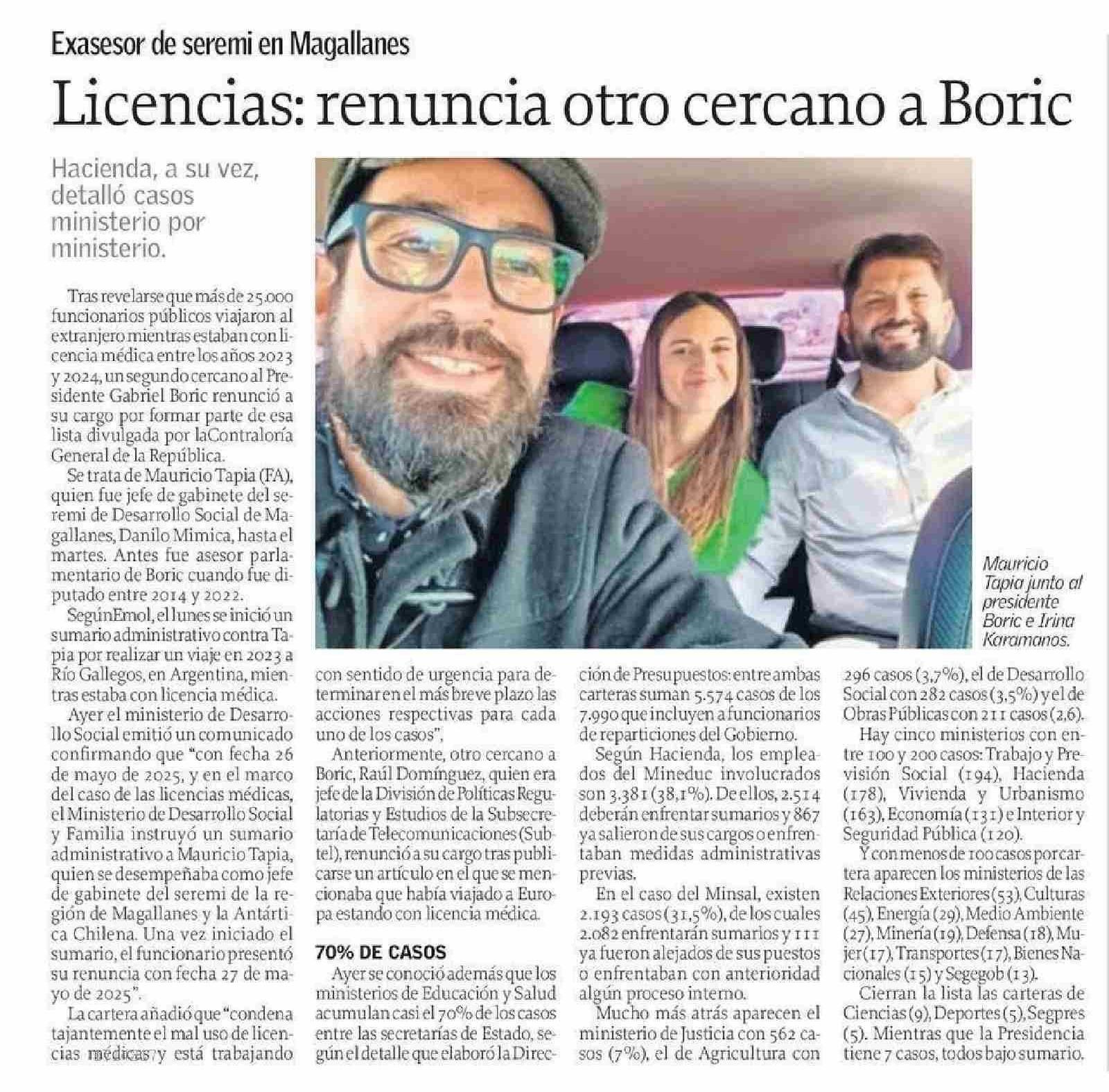 Licencias: renuncia otro cercano a Boric 29-05-2025 El Sur |