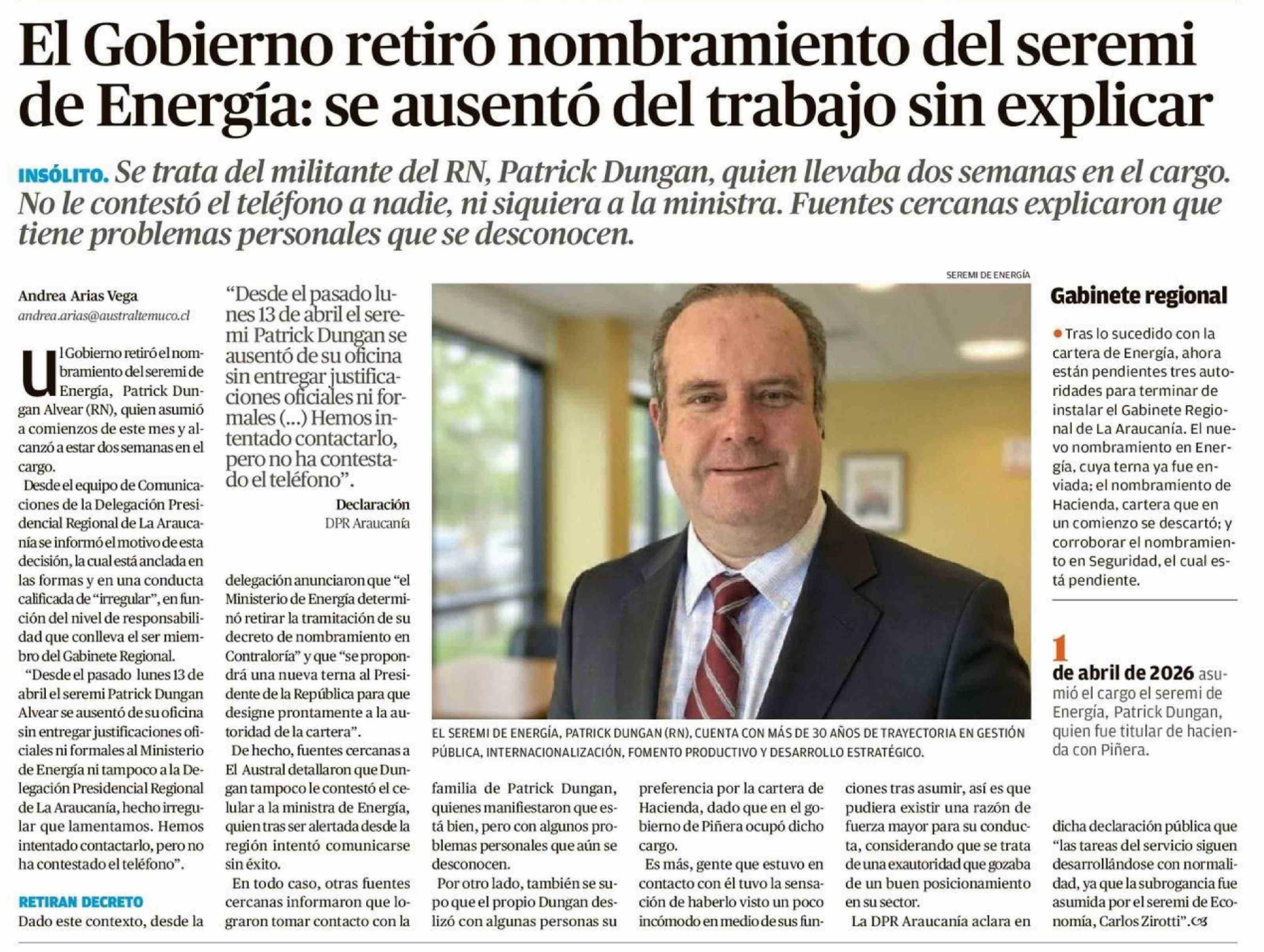 Título: El Gobierno retiró nombramiento del seremi de Energía: se ausentó del trabajo in explicar