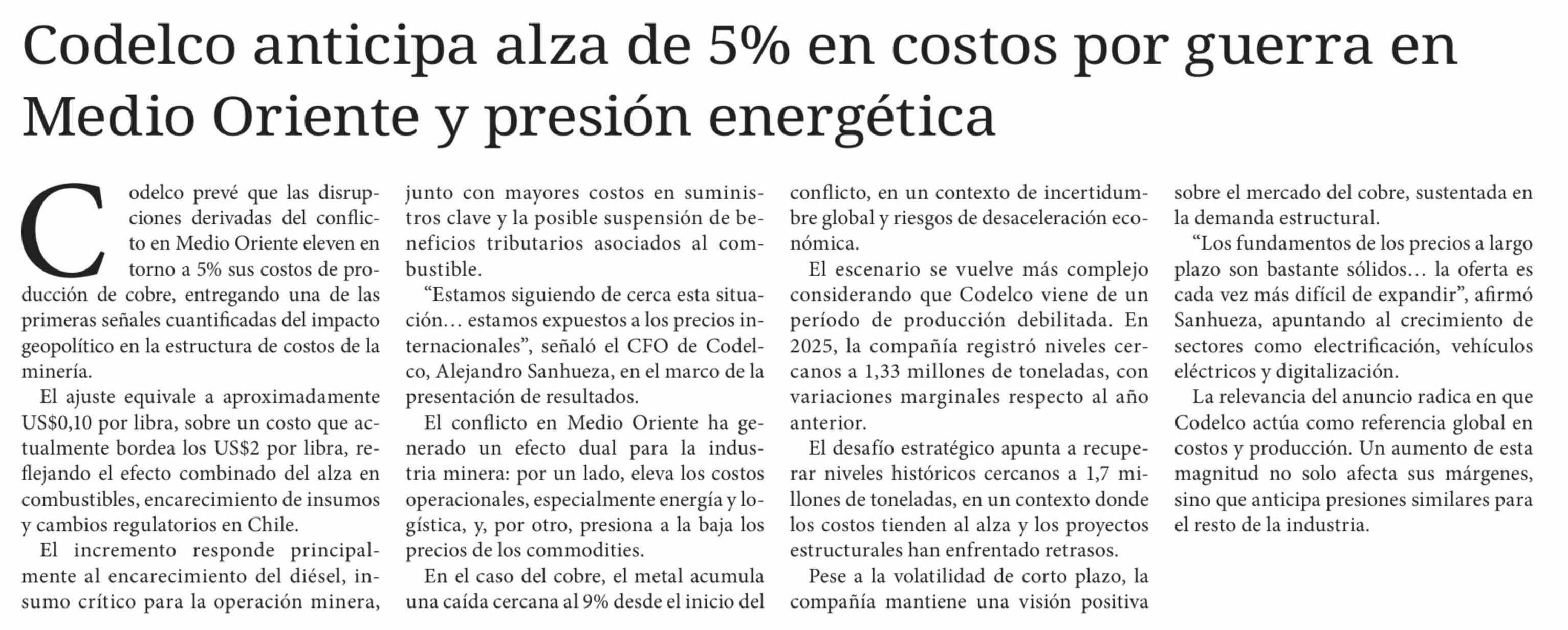 Título: Codelco anticipa alza de 5% en costos por guerra en Medio Oriente y presión energética