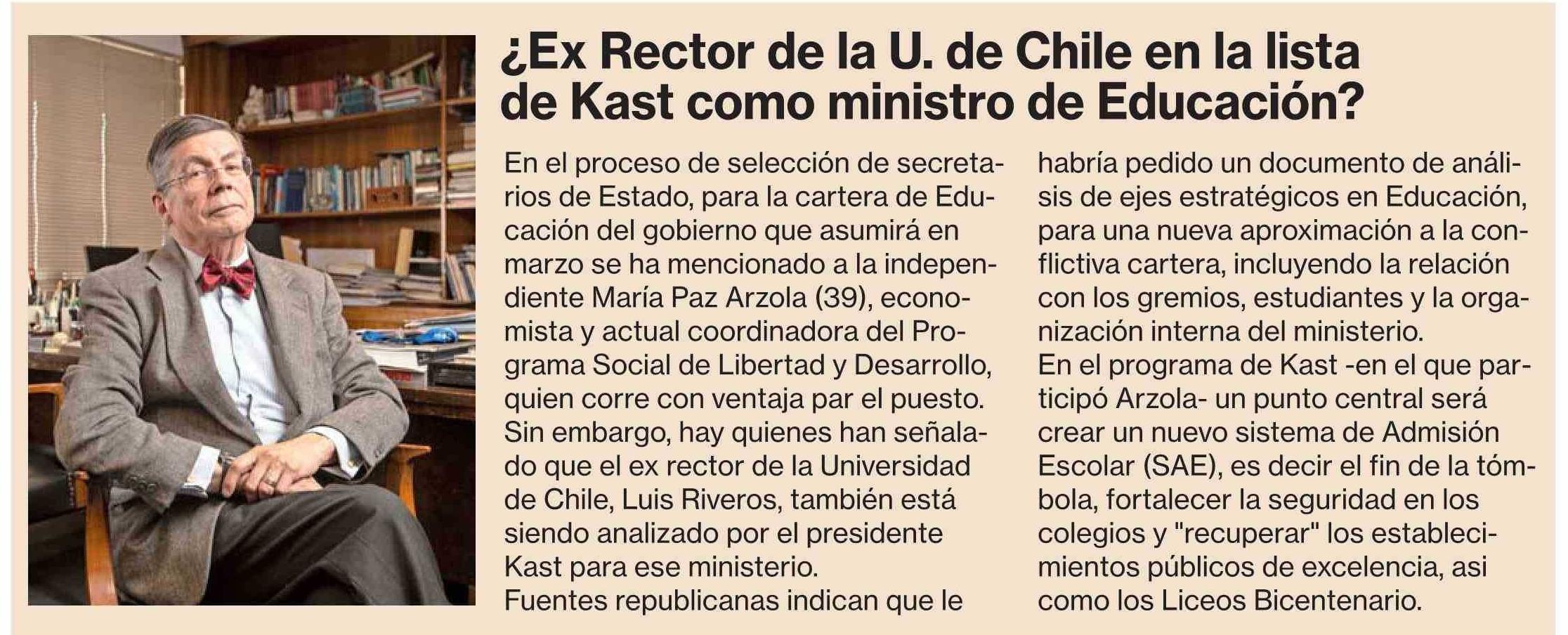 ¿Ex Rector de la U. de Chile en la lista de Kast como ministro de Educación? 09-01-2026 La Segunda |