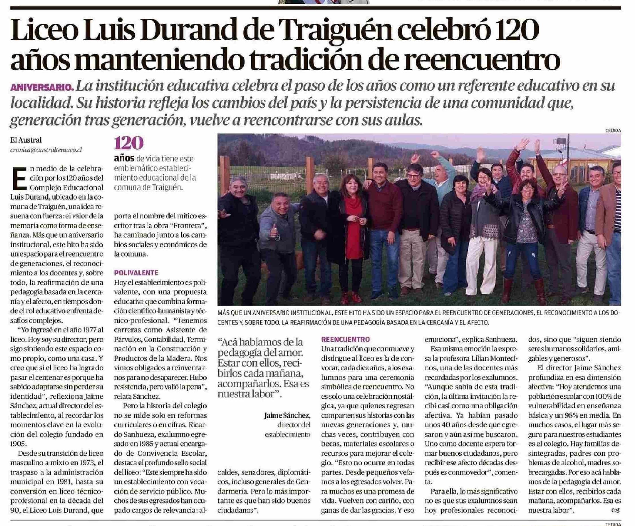 Liceo Luis Durand de Traiguén celebró 120 años manteniendo tradición de reencuentro 27-05-2025 El Austral de la Araucanía |