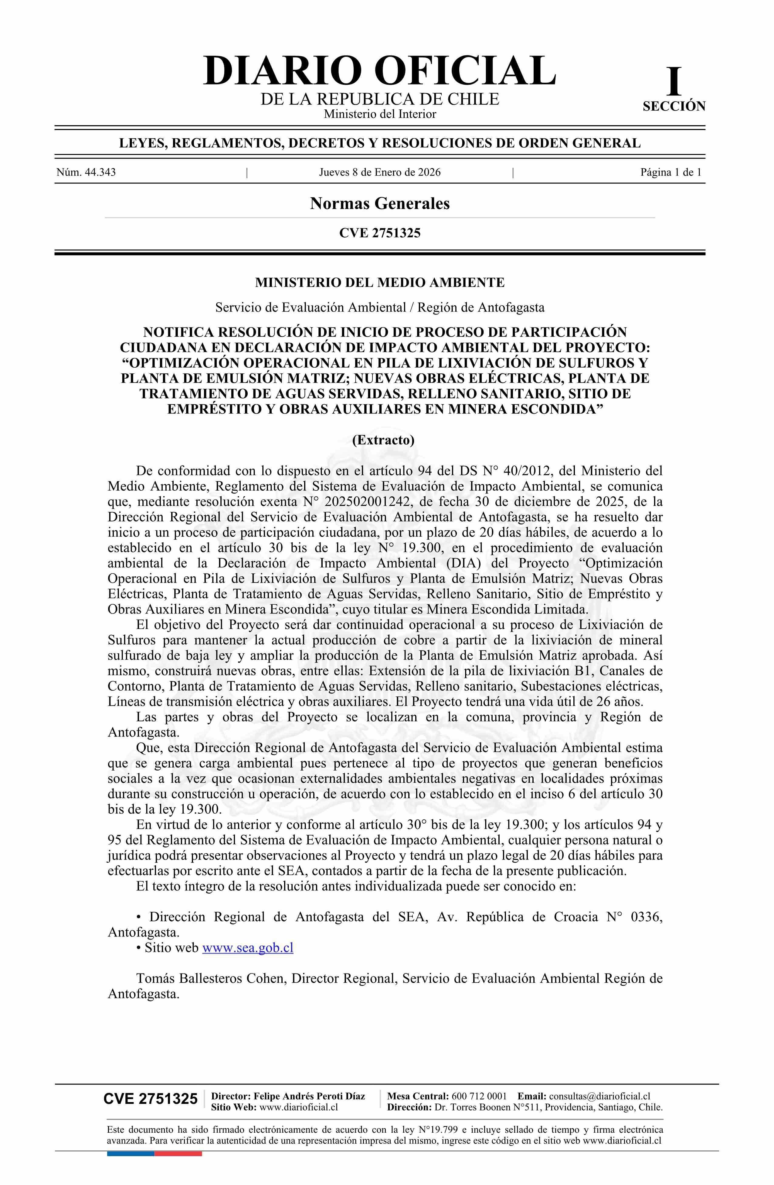 Extracto de resolución exenta número 202502001242, de 2025.- Inicia proceso de participación ciudadana en Declaración de Impacto Ambiental del Proyecto Optimización Operacional en Pila de Lixiviación de Sulfuros y Planta de Emulsión Matriz; Nuevas Obras Eléctricas, Planta de Tratamiento de Aguas Ser