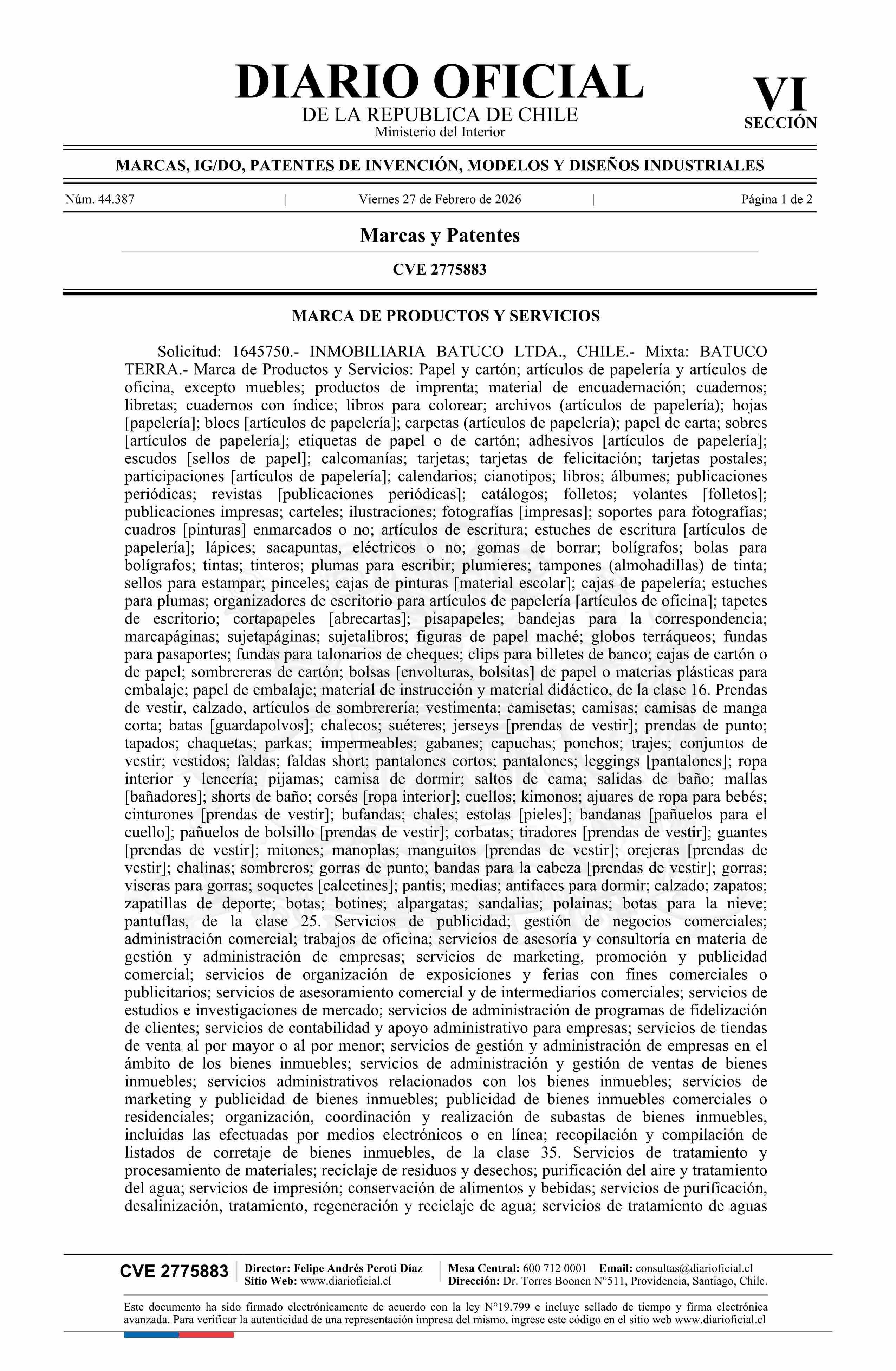 Fuente: Diario Oficial Edición Electrónica (Diario Oficial de Chile - 6 Marcas Y Patentes) Página(s): 57-58