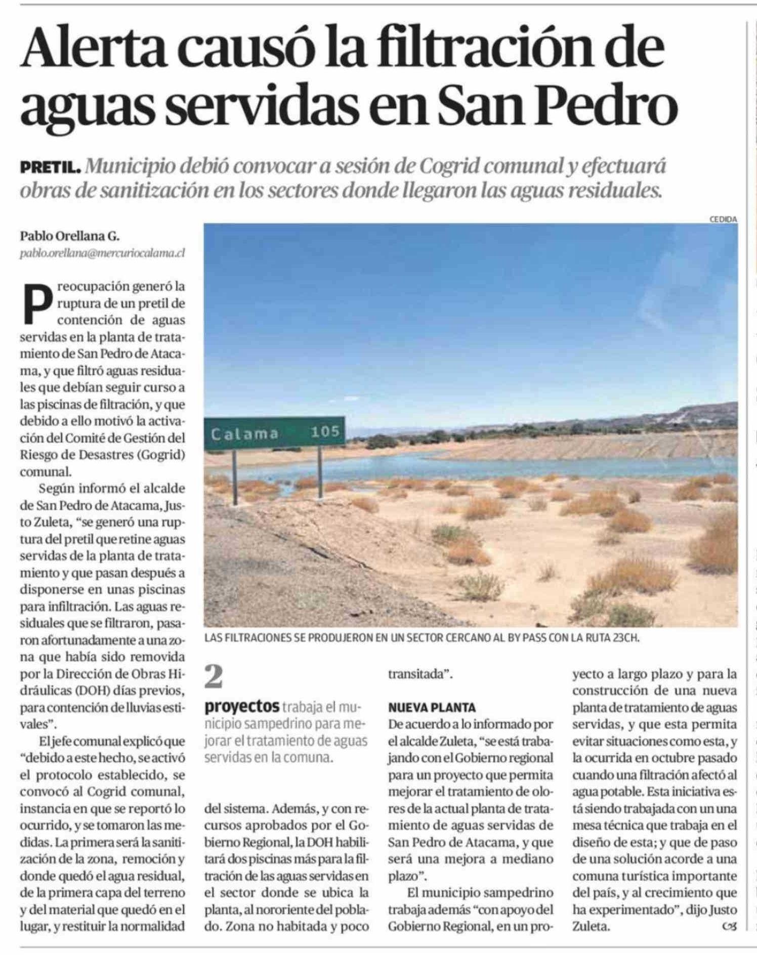 Alerta causó la filtración de aguas servidas en San Pedro 13-03-2026 El Mercurio de Calama |