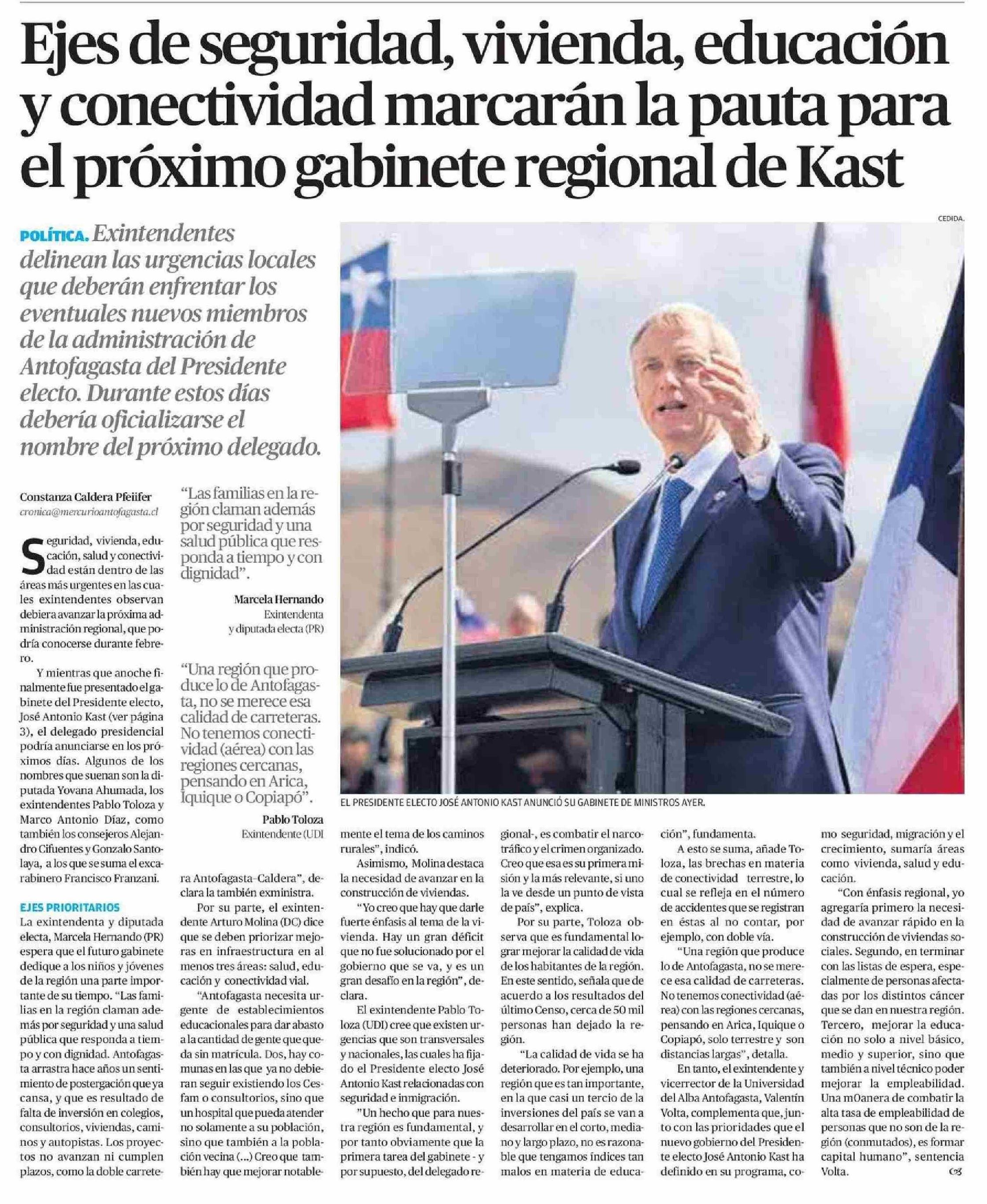 Ejes de seguridad, vivienda, educación y conectividad marcarán la pauta para el próximo gabinete regional de Kast 21-01-2026 El Mercurio de Calama |