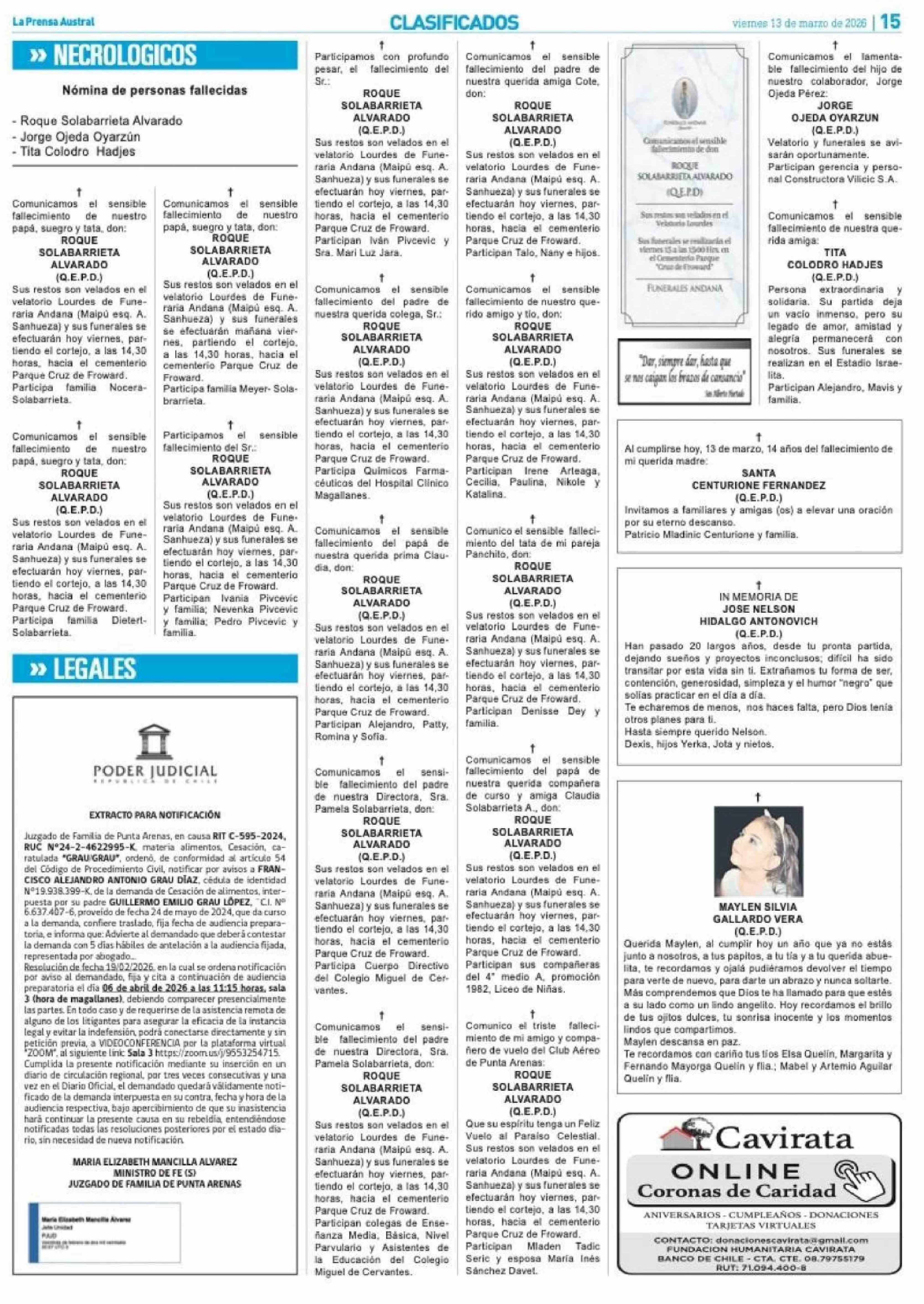NECROLOGICOS 13-03-2026 La Prensa Austral |