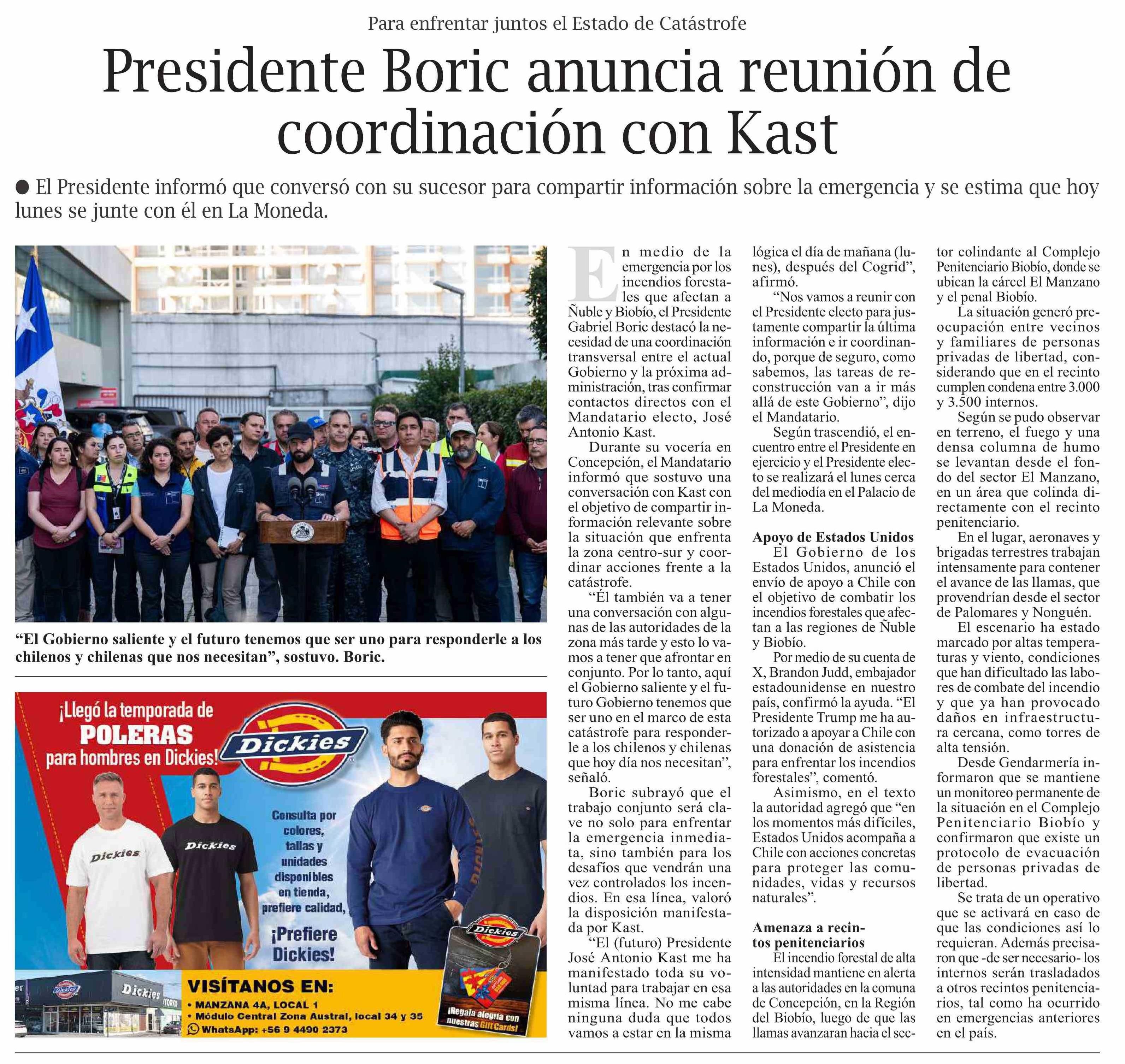 Presidente Boric anuncia reunión de coordinación con Kast 19-01-2026 El Pingüino |