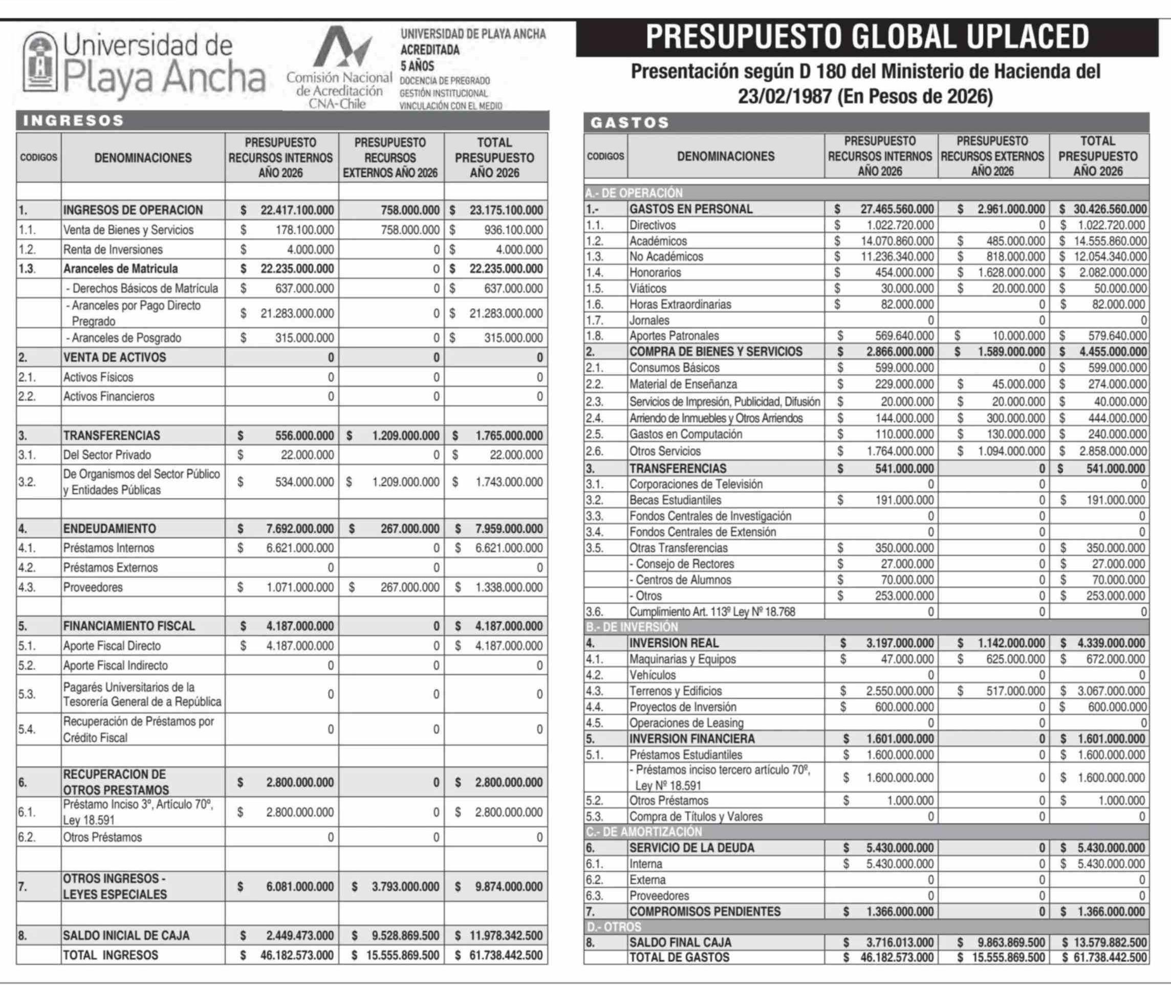 UPLA: PRESUPUESTO RECURSOS EXTERNOS AÑO 2026 20-03-2026 El Observador |