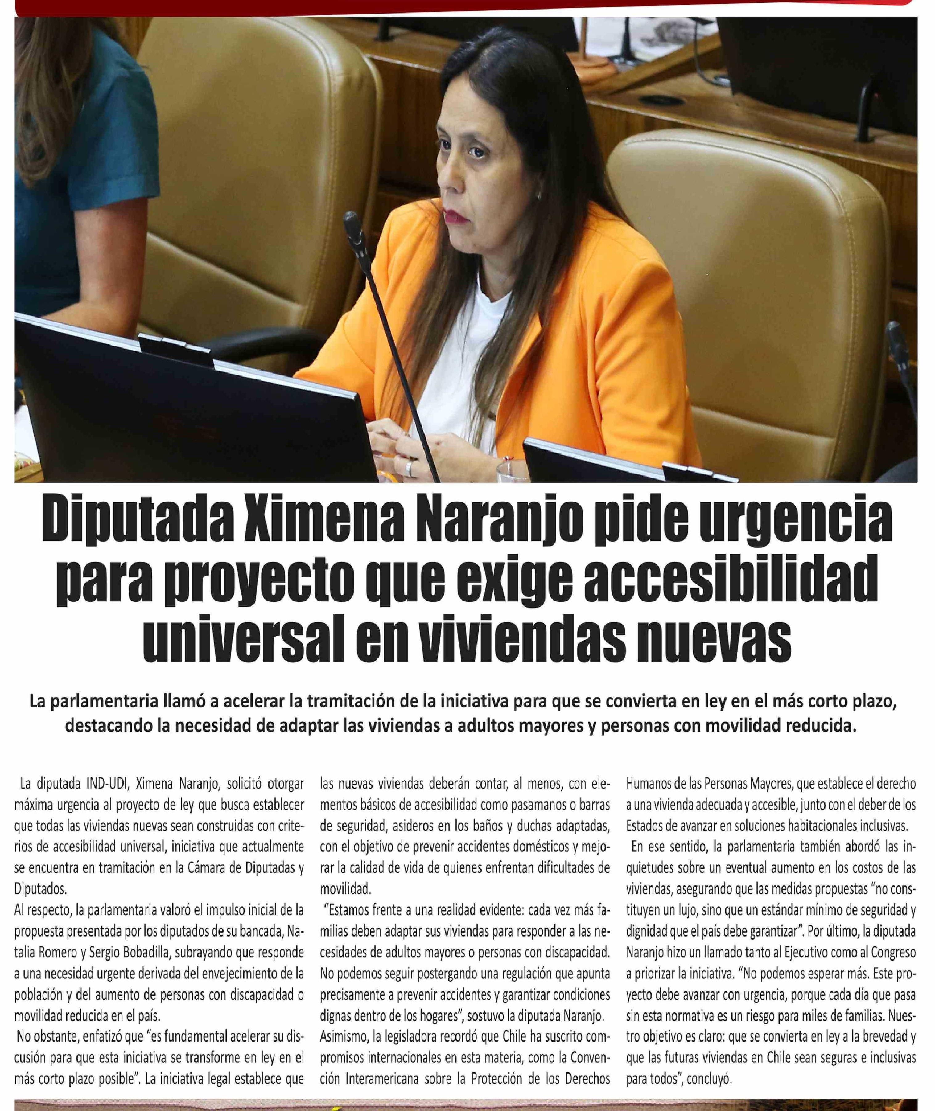 | Título: | Diputada Ximena Naranjo pide urgencia para proyecto que exige accesibilidad universal en viviendas nuevas |