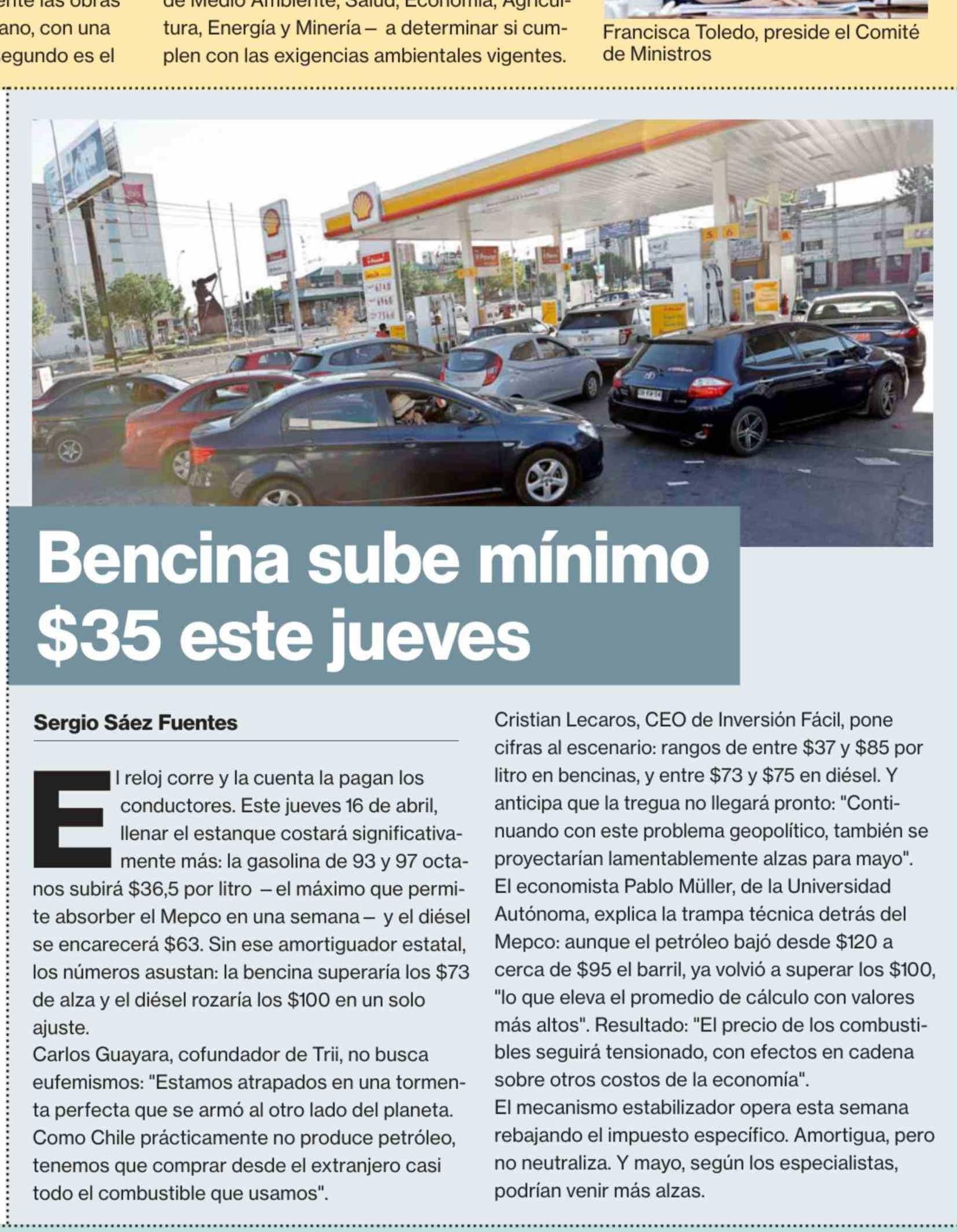 Bencina sube mínimo $35 este jueves 13-04-2026 La Segunda |