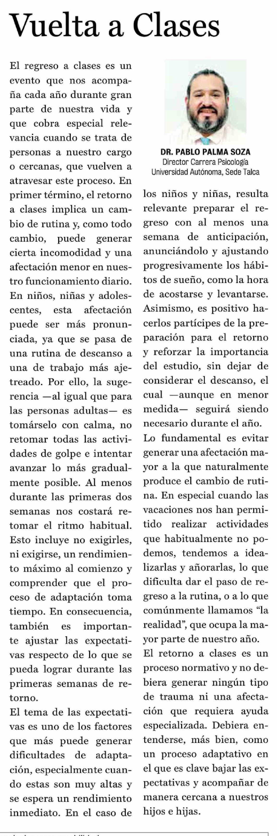 Columnas de Opinión: Vuelta a Clases 06-03-2026 La Prensa de Curicó |