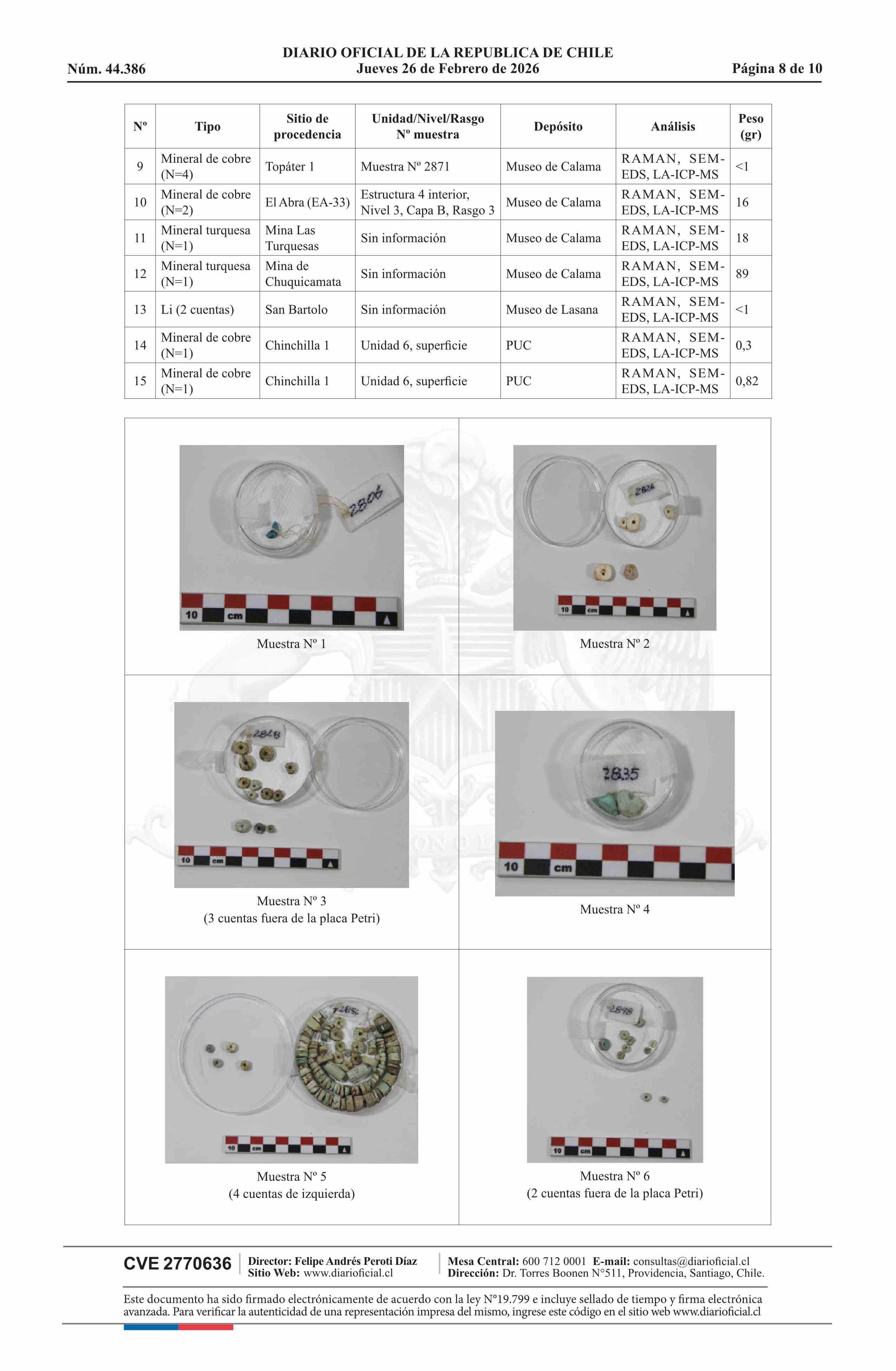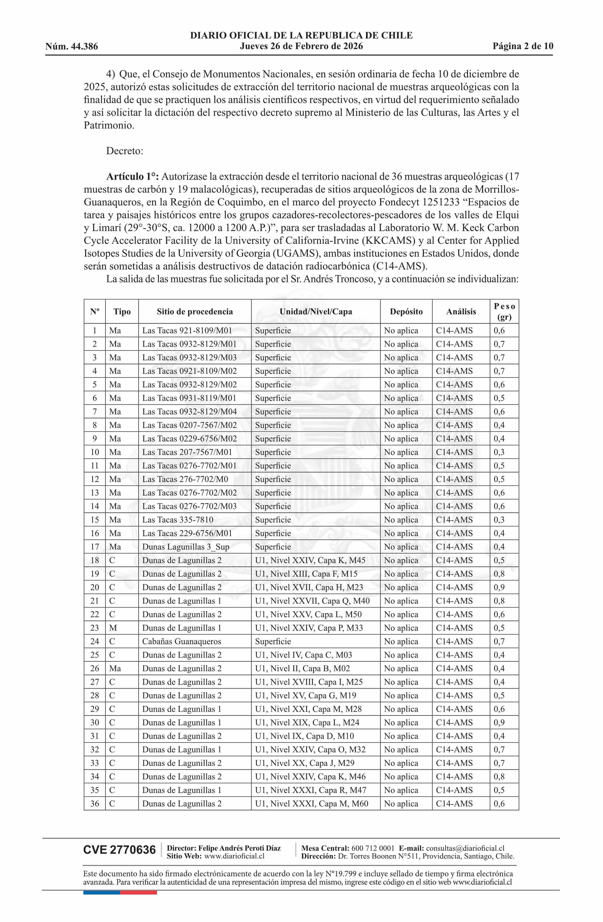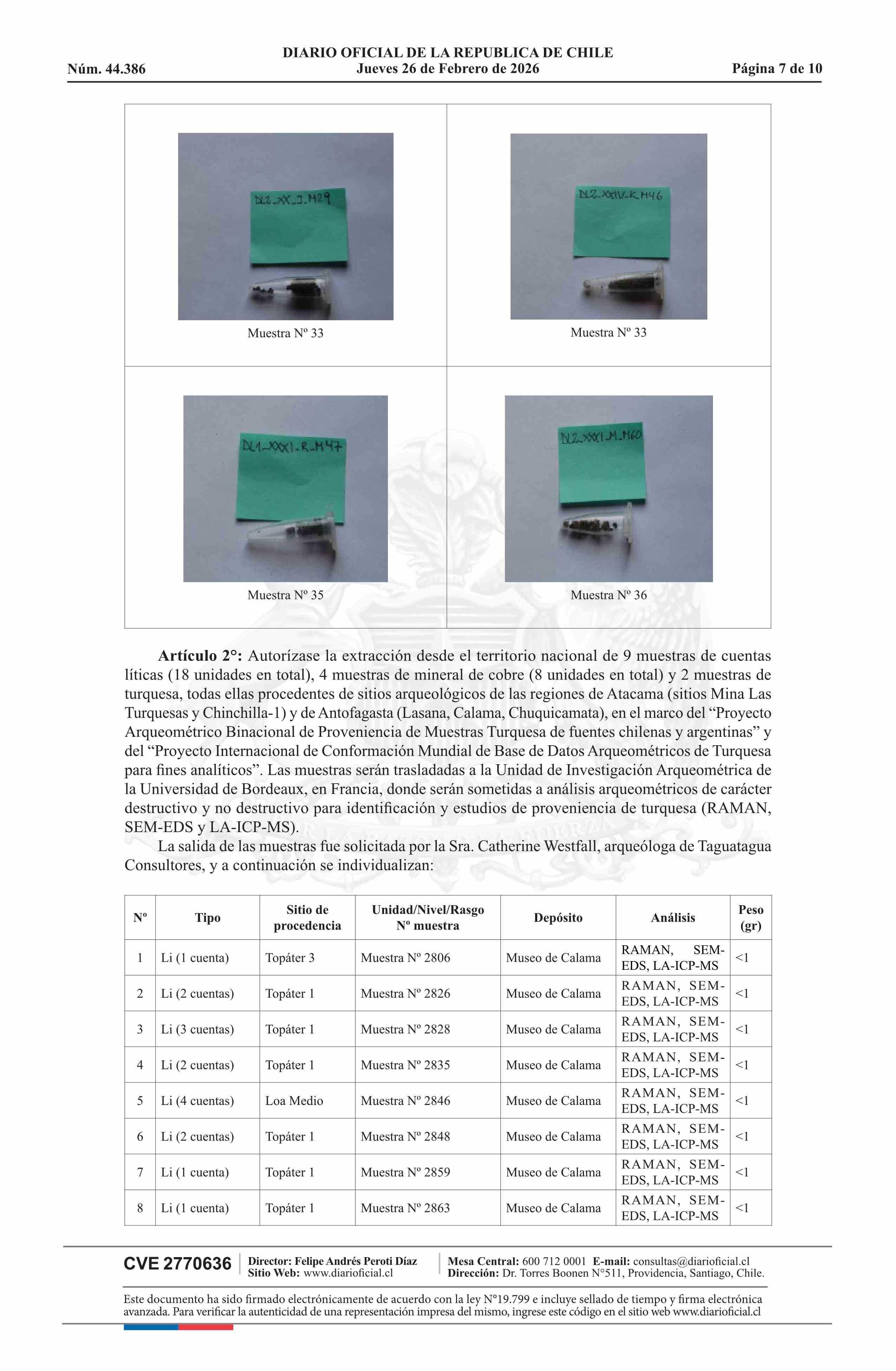 | Título: | Decreto exento número 20, de 2026.- Autoriza la extracción desde el territorio nacional de las muestras arqueológicas que indica |