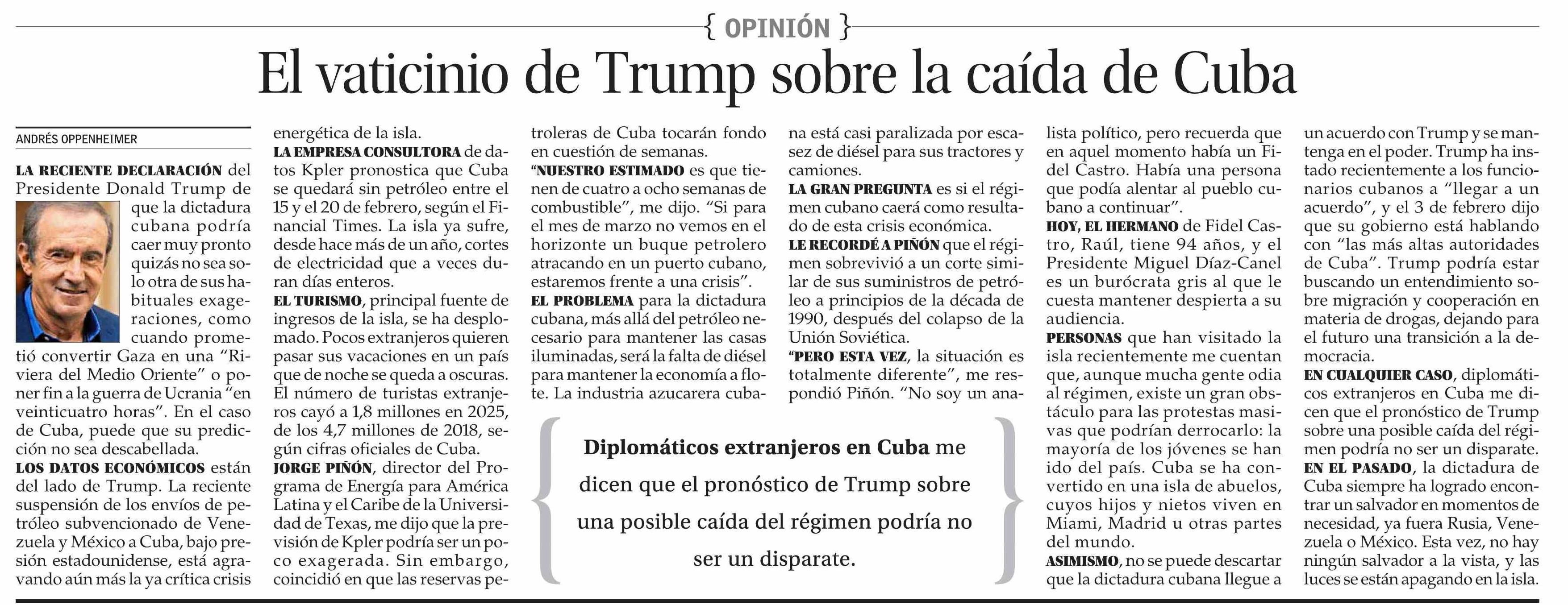 Columnas de Opinión: El vaticinio de Trump sobre la caída de Cuba 08-02-2026 El Mercurio |