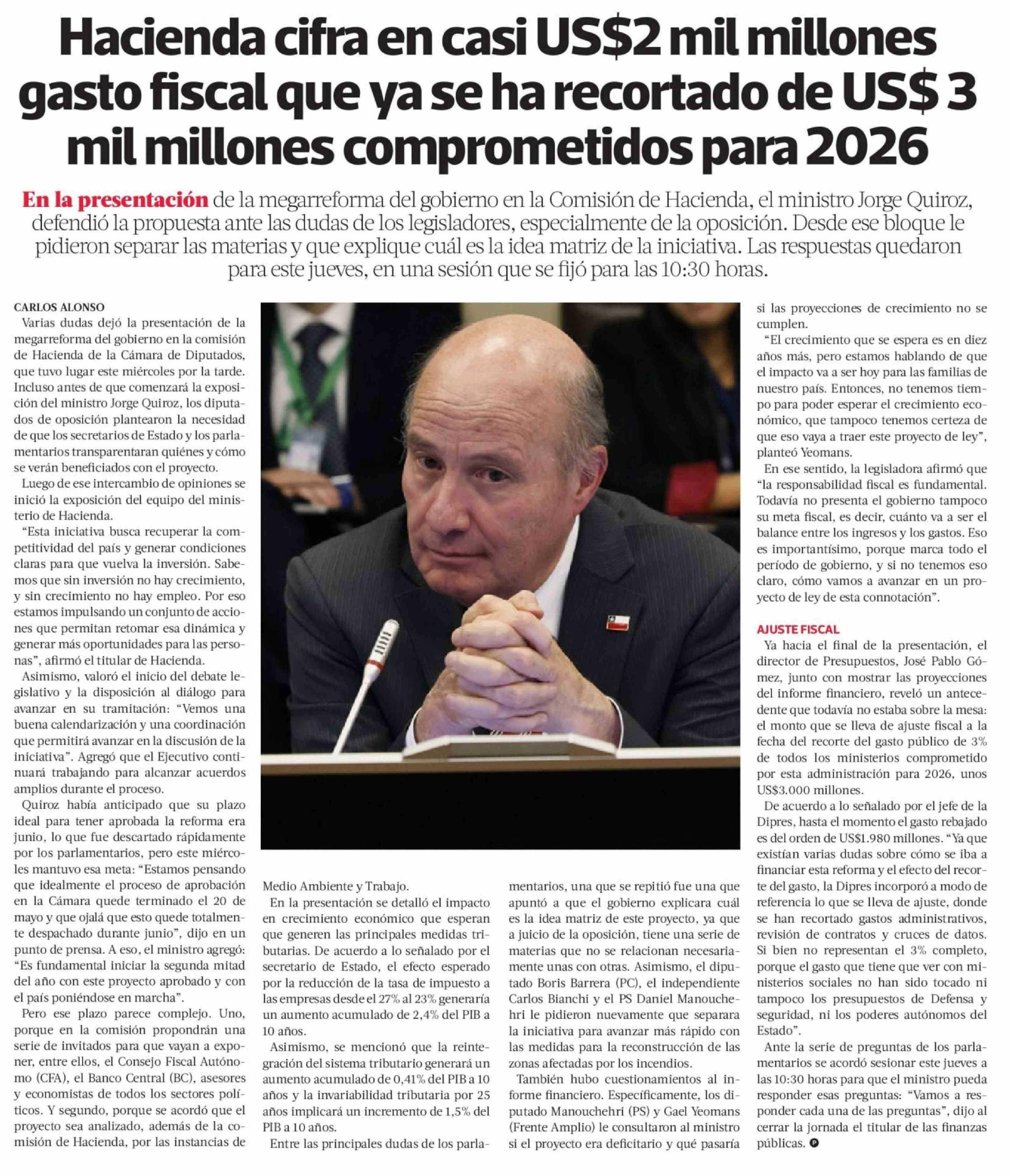 | Título: | Hacienda cifra en casi US$2 mil millones gasto fiscal que ya se ha recortado de US$ 3 mil millones comprometidos para 2026 |