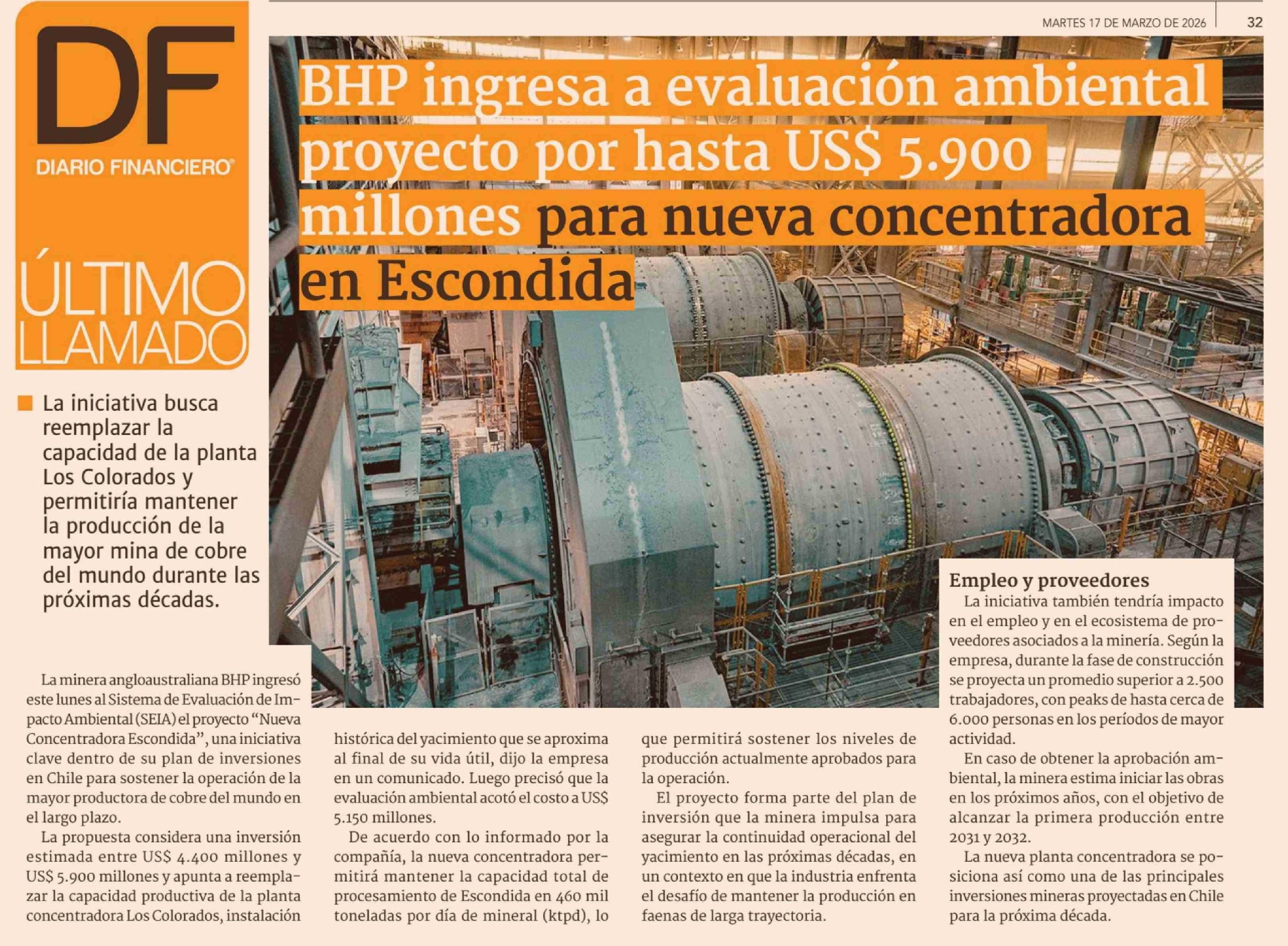 BHP ingresa a evaluación ambiental proyecto por hasta US$ 5.900 millones para nueva concentradora en Escondida 17-03-2026 Diario Financiero |
