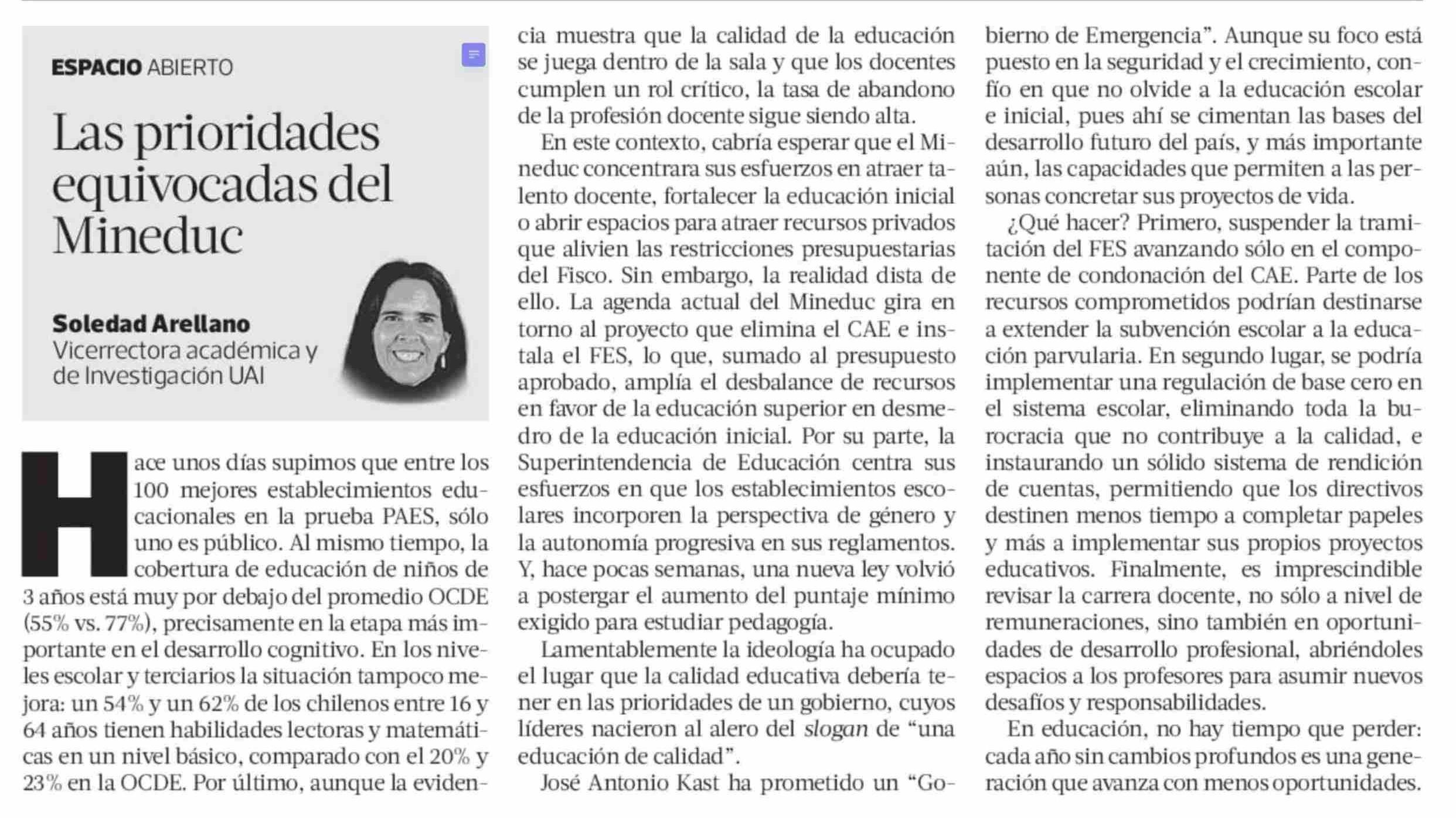 Título: Columnas de Opinión: Las prioridades equivocadas del Mineduc